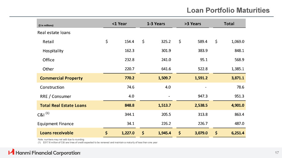Loan Portfolio Distribution CRE C&I ($ in millions) ($ in millions) Construction (1) Multifamily Non - owner Occupied Owner Occupied $79 $413 $2,647 $811 Total Balance $11.23 $2.79 $3.07 $1.14 Average $8.00 $1.10 $1.09 $0.35 Median $49 $298 $1,906 $616 (3) Top Quintile Balance $16.8 or more $2.6 or more $3.7 or more $1.2 or more Top Quintile Loan Size $24.51 $9.93 $11.21 $4.37 Top Quintile Average $24.51 $4.51 $7.34 $2.22 Top Quintile Median Lines of Credit (2) Term (2) $473 $390 Total Balance $0.92 $0.34 Average $0.20 $0.07 Median $385 $336 (3) Top Quintile Balance $0.8 or more $0.2 or more Top Quintile Loan Size $41.94 $1.50 Top Quintile Average $2.51 $0.41 Top Quintile Median Residential Real Estate & Equipment Finance 16 Equipment Finance Residential Real Estate $487 $951 Total Balance $0.04 $0.54 Average $0.06 $0.45 Median $251 $407 Top Quintile Balance (3) $0.1 or more $0.7 or more Top Quintile Loan Size $0.12 $1.17 Top Quintile Average $0.09 $0.93 Top Quintile Median ($ in millions) (1) Represents the total outstanding amount. Advances require authorization and disbursement requests, depending on the progress of the project and inspections. Advances are non - revolving and are made throughout the term, up to the original commitment amount (2) Term loans are a commitment for a specified term. Majority of the Lines of Credit are revolving, including commercial revolvers, with some non - revolvers (sub - notes and working capital tranches) (3) Top quintile represents top 20% of the loans