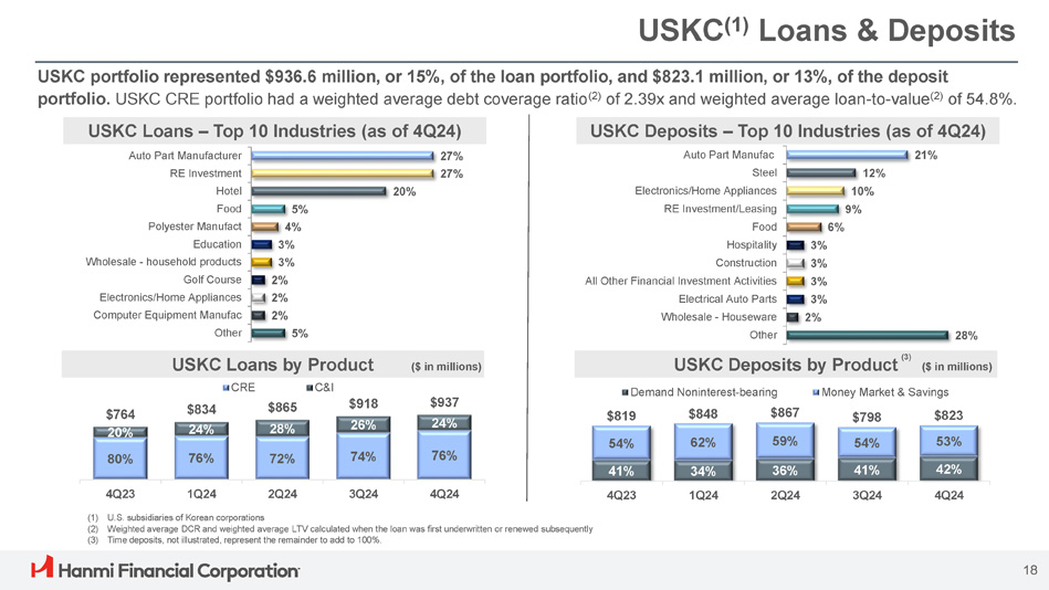 USKC (1) Loans & Deposits 27% 27% 20% 5% 4% 3% 3% 2% 2% 2% 5% Auto Part Manufacturer RE Investment Hotel Food Polyester Manufact Education Wholesale - household products Golf Course Electronics/Home Appliances Computer Equipment Manufac Other USKC portfolio represented $936.6 million, or 15%, of the loan portfolio, and $823.1 million, or 13%, of the deposit portfolio. USKC CRE portfolio had a weighted average debt coverage ratio (2) of 2.39x and weighted average loan - to - value (2) of 54.8%. USKC Loans – Top 10 Industries (as of 4Q24) 76% 72% 74% 76% $764 20% 80% $834 24% $865 28% $918 26% $937 24% CRE C&I USKC Loans by Product ($ in millions) USKC Deposits – Top 10 Industries (as of 4Q24) 21% Auto Part Manufac 12% Steel 10% Electronics/Home Appliances 9% RE Investment/Leasing 6% Food 3% Hospitality 3% Construction 3% All Other Financial Investment Activities 3% Electrical Auto Parts 2% Wholesale - Houseware 28% Other 4Q23 1Q24 2Q24 3Q24 4Q24 (1) U.S. subsidiaries of Korean corporations (2) Weighted average DCR and weighted average LTV calculated when the loan was first underwritten or renewed subsequently (3) Time deposits, not illustrated, represent the remainder to add to 100%. 41% 34% 36% 42% 54% 62% 59% $819 $848 $867 $798 54% 41% $823 53% 4Q23 1Q24 2Q24 3Q24 4Q24 Demand Noninterest - bearing Money Market & Savings 18 USKC Deposits by Product (3) ($ in millions)