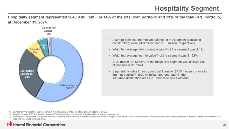 Office Loan Portfolio The CRE office portfolio (1) was $568.9 million (2) at December 31, 2024, representing 9% of the total loan portfolio and 14% of the total CRE portfolio. 80% 12% 4% Remaining = 3% 1% Portfolio by State • Average balance and median balance of the portfolio were $ 4 . 3 million and $ 0 . 97 million, respectively • Weighted average debt coverage ratio (3) of the segment was 2.02x • Weighted average loan to value (3) of the segment was 55.44% • 30.21% of the portfolio is expected to reprice in 1 to 3 months • Delinquent loans represented 0.04% of the office portfolio • Criticized loans represented 1.14% of the office portfolio Rate Distribution (1) Segment represents exposure in CRE and excludes $17.3 million in construction. 7.6% of the portfolio is owner occupied (2) SBA CRE office loans were $6.7 million, or 1.2% of total office loans, at December 31, 2024 (3) Weighted average DCR and weighted average LTV calculated when the loan was first underwritten or renewed subsequently 65% 35% Fixed Variable 19