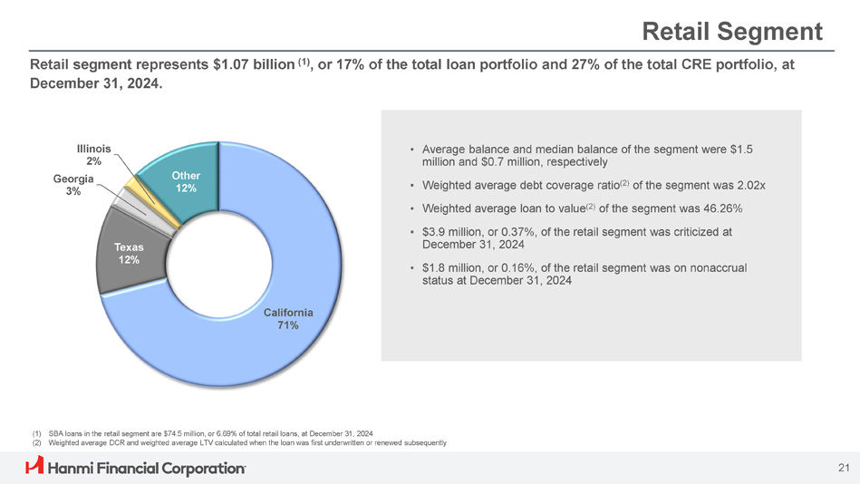 Retail Segment Retail segment represents $1.07 billion (1) , or 17% of the total loan portfolio and 27% of the total CRE portfolio, at December 31, 2024. (1) SBA loans in the retail segment are $74.5 million, or 6.69% of total retail loans, at December 31, 2024 (2) Weighted average DCR and weighted average LTV calculated when the loan was first underwritten or renewed subsequently • Average balance and median balance of the segment were $1.5 million and $0.7 million, respectively • Weighted average debt coverage ratio (2) of the segment was 2.02x • Weighted average loan to value (2) of the segment was 46.26% • $3.9 million, or 0.37%, of the retail segment was criticized at December 31, 2024 • $1.8 million, or 0.16%, of the retail segment was on nonaccrual status at December 31, 2024 California 71% 21 Texas 12% Illinois 2% Georgia 3% Other 12%