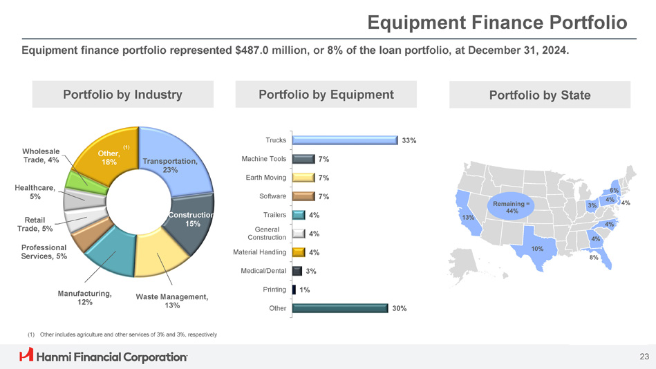 Equipment Finance Portfolio Equipment finance portfolio represented $487.0 million, or 8% of the loan portfolio, at December 31, 2024. Portfolio by Industry Portfolio by Equipment Portfolio by State 33% Trucks 7% 7% Machine Tools Earth Moving Transportation, 23% (1) Wholesale Other, Trade, 4% 18% 6% Healthcare, 4% 4% 4% 3% 4% Remaining = 44% 13% 7% 4% 4% Software Trailers General Construction Construction 15% 5% Retail Trade, 5% 8% 10% 4% Material Handling Professional Services, 5% 3% Medical/Dental 1% 30% Manufacturing, Waste Management, Printing 12% 13% Other (1) Other includes agriculture and other services of 3% and 3%, respectively 23