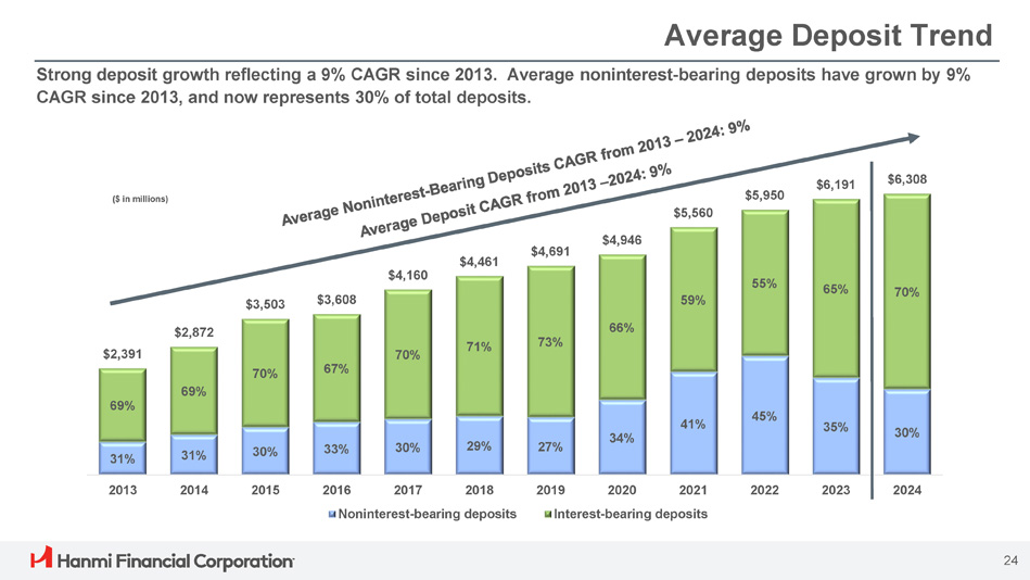 31% 31% 30% 33% 30% 29% 27% 34% 41% 45% 35% 30% 69% 69% 70% 67% 70% 71% 73% 66% 59% 55% 65% 70% $2,391 $2,872 $3,503 $3,608 $4,160 $4,461 $4,691 $5,560 $4,946 $5,950 $6,191 $6,308 2013 2014 2015 2022 2023 2024 2016 2017 2018 Noninterest - bearing deposits 2019 2020 2021 Interest - bearing deposits ($ in millions) Strong deposit growth reflecting a 9% CAGR since 2013. Average noninterest - bearing deposits have grown by 9% CAGR since 2013, and now represents 30% of total deposits. 24 Average Deposit Trend