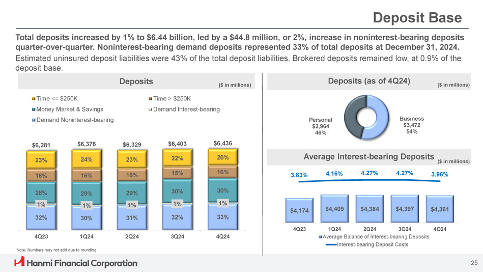 3.83% 4.16% 4.27% 4.27% 3.96% $4,174 $4,409 $4,384 $4,397 $4,361 1Q24 2Q24 3Q24 Average Balance of Interest - bearing Deposits Interest - bearing Deposit Costs 4Q23 4Q24 Deposit Base Total deposits increased by 1% to $6.44 billion, led by a $44.8 million, or 2%, increase in noninterest - bearing deposits quarter - over - quarter. Noninterest - bearing demand deposits represented 33% of total deposits at December 31, 2024. Estimated uninsured deposit liabilities were 43% of the total deposit liabilities. Brokered deposits remained low, at 0.9% of the deposit base. 4Q23 1Q24 Note: Numbers may not add due to rounding Deposits Deposits (as of 4Q24) ($ in millions) ($ in millions) Average Interest - bearing Deposits Business $3,472 54% Personal $2,964 46% ($ in millions) 32% 30% 31% 32% 33% 1% 1% 1% 1% 1% 28% 29% 29% 30% 30% 16% 16% 16% 15% 16% 23% 24% 23% 22% 20% $6,281 $6,376 $6,329 $6,403 $6,436 2Q24 3Q24 4Q24 Time <= $250K Money Market & Savings Demand Noninterest - bearing Time > $250K Demand Interest - bearing 25