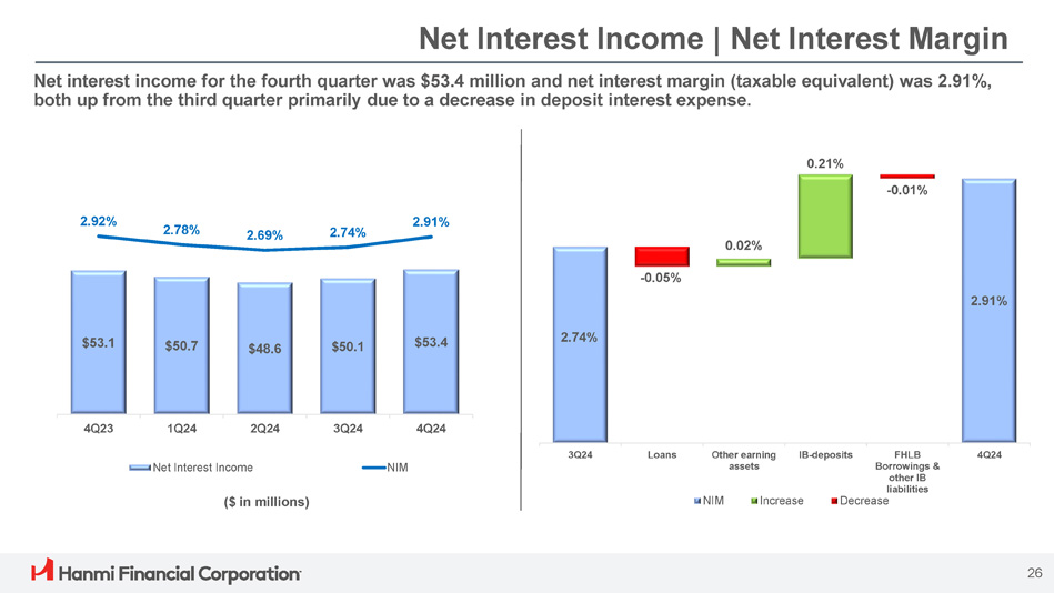Net Interest Income | Net Interest Margin Net interest income for the fourth quarter was $53.4 million and net interest margin (taxable equivalent) was 2.91%, both up from the third quarter primarily due to a decrease in deposit interest expense. ($ in millions) 2.74% - 0.05% 0.02% 0.21% - 0.01% 2.91% 3Q24 Loans Other earning assets IB - deposits FHLB Borrowings & other IB liabilities Decrease 4Q24 NIM Increase $53.1 $50.7 $48.6 $50.1 $53.4 2.92% 2.78% 2.69% 2.74% 2.91% 4Q23 1Q24 2Q24 3Q24 4Q24 Net Interest Income NIM 26
