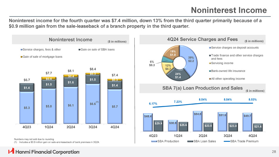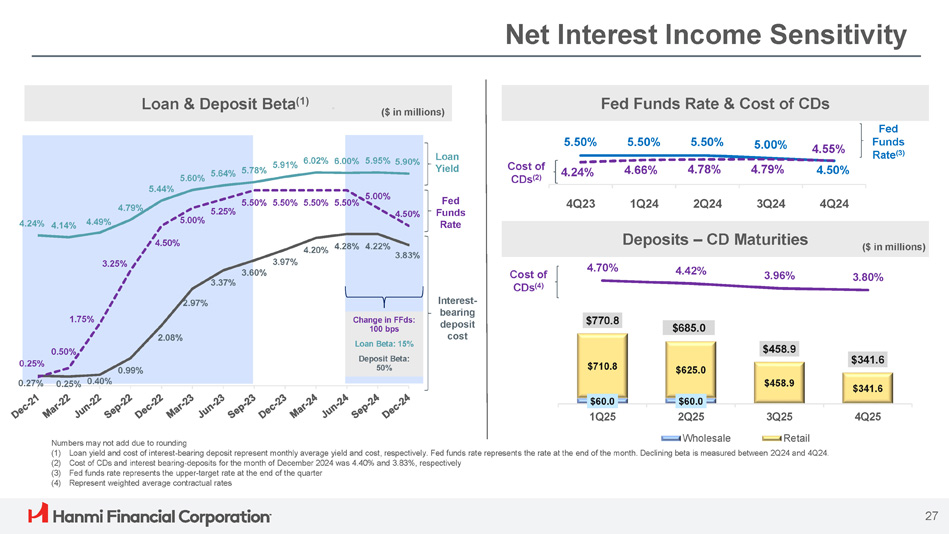 4.24% 4.14% 4.49% 4.79% 5.44% 5.60% 5.64% 5.78% 5.91% 6.02% 6.00% 5.95% 5.90% 0.27 % 0.25% 0.40% 0.99% 2.08% 2.97% 3.37% 3.60% 3.97% 4.20% 4.28% 4.22% 3.83% 0.25% 0.50% 1.75% 3.25% 4.50% 5.00% 5.25% 5.50% 5.50% 5.50% 5.50% 5.00% 4.50% Deposits – CD Maturities Net Interest Income Sensitivity Loan & Deposit Beta (1) . Fed Funds Rate & Cost of CDs $60.0 $60.0 $710.8 $625.0 $458.9 $341.6 $770.8 $685.0 $458.9 $341.6 4.70% 4.42% 3.96% 3.80% 1Q25 4Q25 2Q25 Wholesale 3Q25 Retail ($ in millions) 5.50% 5.50% 5.50% 5.00% 4.55% 4.50% 4.79% 4.78% 4.66% 4.24% 4Q24 3Q24 2Q24 1Q24 4Q23 Fed Funds Rate (3) Cost of CDs (2) ($ in millions) Cost of CDs (4) Numbers may not add due to rounding (1) Loan yield and cost of interest - bearing deposit represent monthly average yield and cost, respectively. Fed funds rate represents the rate at the end of the month. Declining beta is measured between 2Q24 and 4Q24. (2) Cost of CDs and interest bearing - deposits for the month of December 2024 was 4.40% and 3.83%, respectively (3) Fed funds rate represents the upper - target rate at the end of the quarter (4) Represent weighted average contractual rates Fed Funds Rate Loan Yield Interest - bearing deposit cost Change in FFds: 100 bps Loan Beta: 15% Deposit Beta: 50% 27