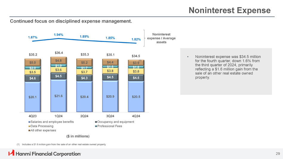39% $2.2 24% $1.4 12% $0.7 6% $0.3 19% $1.0 Service charges on deposit accounts Trade finance and other service charges and fees Servicing income Bank - owned life insurance All other operating income Noninterest Income SBA 7(a) Loan Production and Sales ($ in millions) $48.4 $30.8 $54.5 $51.6 $49.7 $29.9 $25.6 $23.5 $23.0 $21.6 6.17% 7.23% 8.54% 8.54% 8.53% 4Q23 1Q24 2Q24 SBA Loan Sales SBA Production 3Q24 4Q24 SBA Trade Premium Noninterest income for the fourth quarter was $7.4 million, down 13% from the third quarter primarily because of a $0.9 million gain from the sale - leaseback of a branch property in the third quarter. Noninterest Income 4Q24 Service Charges and Fees ($ in millions) ($ in millions) $5.3 $5.8 $6.1 $5.7 $1.4 $0.4 $1.5 $6.7 $7.7 $8.1 $0.4 $1.6 $8.4 $0.3 $1.5 $7.4 $0.3 $1.4 4Q23 1Q24 2Q24 3Q24 4Q24 (1) $6.6 Service charges, fees & other Gain on sale of SBA loans Gain of sale of mortgage loans Numbers may not add due to rounding (1) Includes a $0.9 million gain on sale - and - leaseback of bank premises in 3Q24. 28