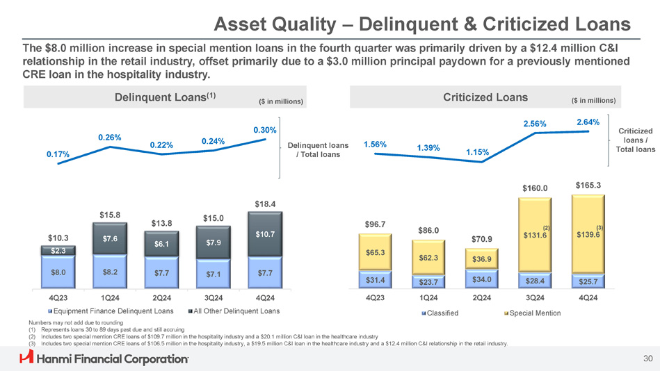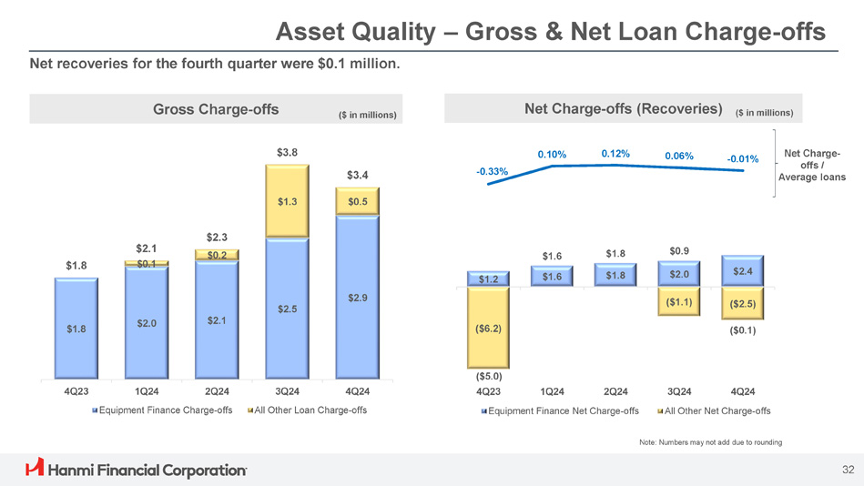 $0.1 $0.1 $0.8 $0.8 $0.1 $15.6 $14.1 $20.0 $16.3 $14.4 4Q23 3Q24 4Q24 1Q24 2Q24 Nonperforming loans OREO Asset Quality – Nonperforming Assets & Nonaccrual Loans 0.21% 0.19% 0.26% 0.21% 0.19% Nonperforming assets / Total assets Nonperforming Assets (1) Nonaccrual Loans Nonperforming assets were $14.4 million at the end of the fourth quarter, down from $16.3 million at the end of the third quarter. ($ in millions) ($ in millions) Note: Numbers may not add due to rounding (1) Nonperforming assets exclude repossessed personal property of $1.3 million, $1.3 million, $1.2 million, $1.2 million, and $0.6 million for December 31, 2023, March 31, 2024, June 30, 2024, September 30, 2024, and December 31, 2024, respectively; also excludes the $27.2 million held for sale nonperforming loan at September 30, 2024 (2) Specific allowance for credit losses at December 31, 2023, March 31, 2024, June 30, 2024, September 30, 2024, and December 31, 2024 was $3.4 million, $5.3 million, $6.8 million, $5.2 million, and $6.2 million, respectively (3) RRE includes consumer loans $14.0 $3.9 $3.2 $19.2 $3.9 $5.9 $0.8 $8.8 $9.6 $8.6 $6.9 $7.3 $14.3 $19.2 $15.5 $14.0 $15.5 4Q24 3Q24 2Q24 1Q24 4Q23 Equipment Finance All other CRE and C&I < $3M (2) 31 (3) RRE All other CRE and C&I >= $3M (2) (2) $15.5 $4.9 $3.3 $14.3 (2) $3.6 $1.9 $15.2 (2) $3.7 $1.9