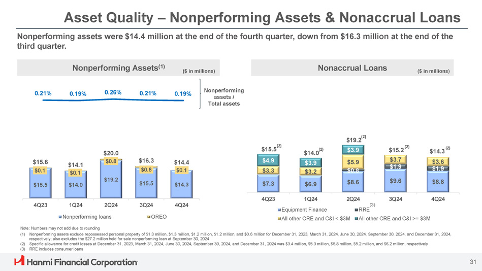 Asset Quality – Delinquent & Criticized Loans Delinquent loans / Total loans $65.3 $62.3 $36.9 $96.7 $86.0 $70.9 $160.0 $165.3 1.56% 1.39% 1.15% 2.56% 2.64% Classified Special Mention Delinquent Loans (1) Criticized Loans Criticized loans / Total loans The $8.0 million increase in special mention loans in the fourth quarter was primarily driven by a $12.4 million C&I relationship in the retail industry, offset primarily due to a $3.0 million principal paydown for a previously mentioned CRE loan in the hospitality industry. $8.0 $8.2 $7.7 $7.1 $7.7 $7.6 $6.1 $7.9 $10.7 $10.3 $2.3 $25.7 $28.4 $34.0 $23.7 $31.4 4Q24 3Q24 2Q24 1Q24 4Q23 4Q24 3Q24 2Q24 1Q24 4Q23 (2) $131.6 (3) $139.6 $15.8 $13.8 $15.0 $18.4 0.17% 0.26% 0.22% 0.24% 0.30% Equipment Finance Delinquent Loans All Other Delinquent Loans Numbers may not add due to rounding 30 ($ in millions) ($ in millions) (1) Represents loans 30 to 89 days past due and still accruing (2) Includes two special mention CRE loans of $109.7 million in the hospitality industry and a $20.1 million C&I loan in the healthcare industry (3) Includes two special mention CRE loans of $106.5 million in the hospitality industry, a $19.5 million C&I loan in the healthcare industry and a $12.4 million C&I relationship in the retail industry.