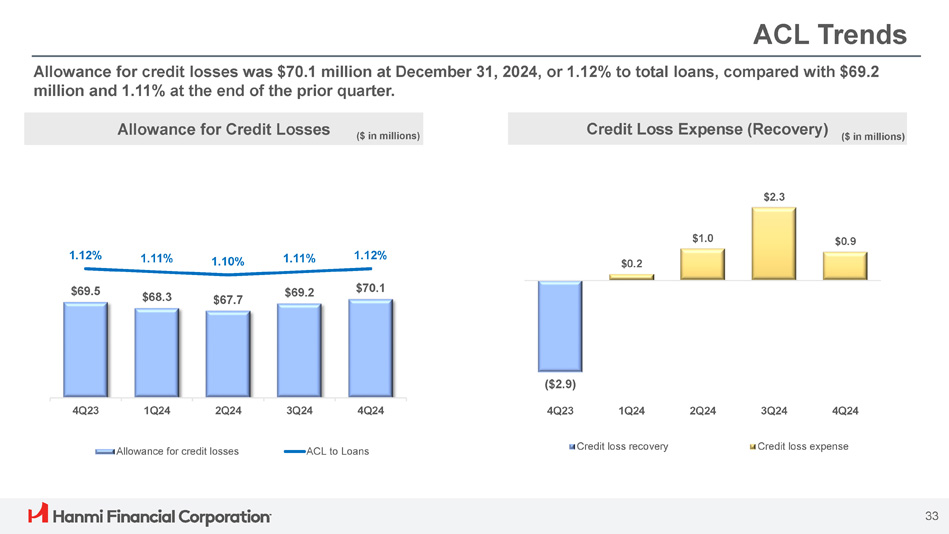 Asset Quality – Gross & Net Loan Charge - offs Gross Charge - offs Net Charge - offs (Recoveries) Net Charge - offs / Average loans Net recoveries for the fourth quarter were $0.1 million. ($ in millions) ($ in millions) $1.8 $2.0 $2.1 $2.5 $2.9 $1.3 $0.5 $1.8 $2.1 $0.1 $2.3 $0.2 $3.8 $3.4 4Q23 1Q24 2Q24 Equipment Finance Charge - offs 3Q24 4Q24 All Other Loan Charge - offs Note: Numbers may not add due to rounding $1.2 $1.6 $1.8 $2.0 $2.4 ($6.2) ($1.1) ($2.5) $1.6 $1.8 $0.9 ($0.1) - 0.33% 0.10% 0.12% 0.06% - 0.01% 3Q24 4Q24 All Other Net Charge - offs ($5.0) 4Q23 1Q24 2Q24 Equipment Finance Net Charge - offs 32