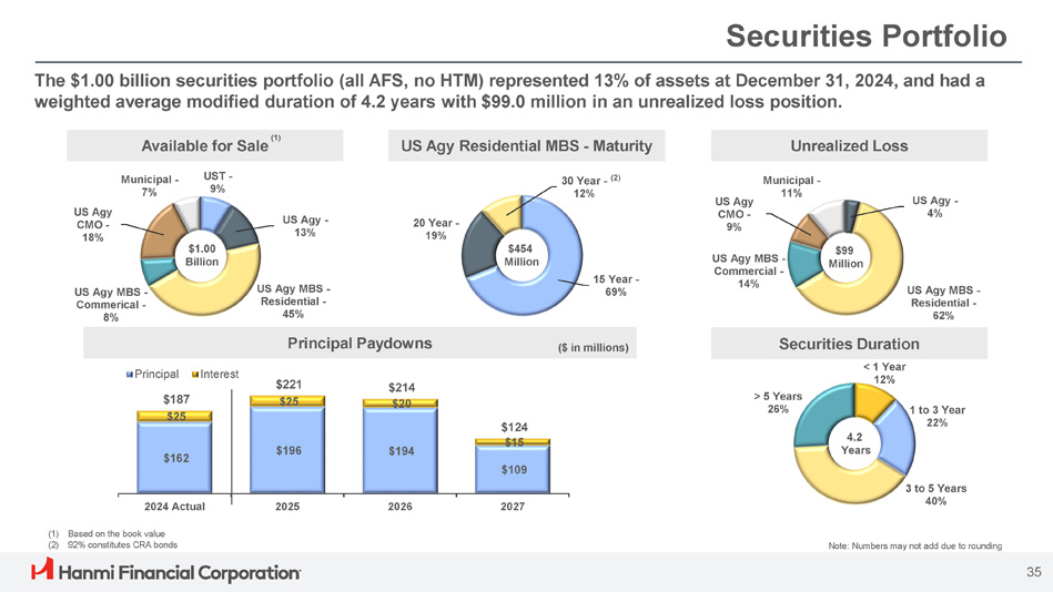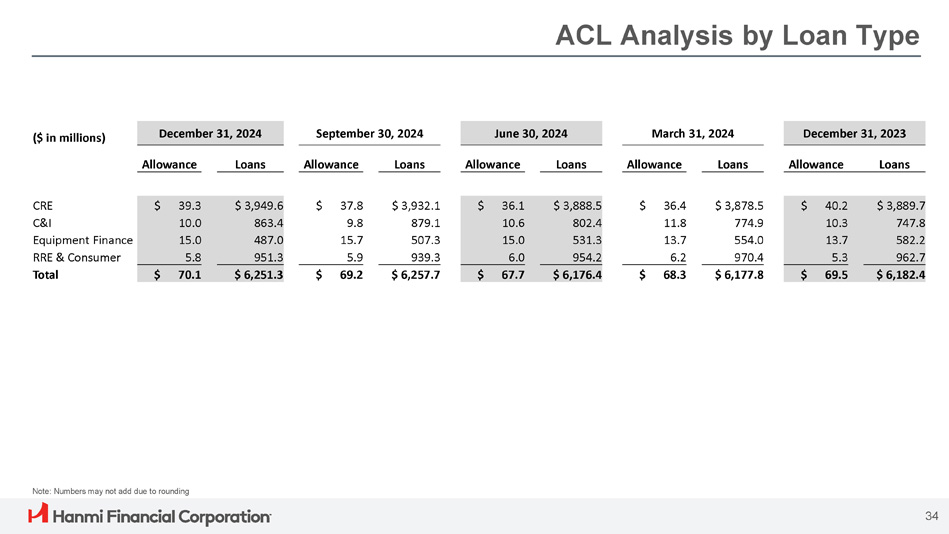 ACL Analysis by Loan Type December 31, 2023 March 31, 2024 June 30, 2024 September 30, 2024 December 31, 2024 ($ in millions) Loans Allowance Loans Allowance Loans Allowance Loans Allowance Loans Allowance $ 3,889.7 $ 40.2 $ 3,878.5 $ 36.4 $ 3,888.5 $ 36.1 $ 3,932.1 $ 37.8 $ 3,949.6 $ 39.3 CRE 747.8 10.3 774.9 11.8 802.4 10.6 879.1 9.8 863.4 10.0 C&I 582.2 13.7 554.0 13.7 531.3 15.0 507.3 15.7 487.0 15.0 Equipment Finance 962.7 5.3 970.4 6.2 954.2 6.0 939.3 5.9 951.3 5.8 RRE & Consumer $ 6,182.4 $ 69.5 $ 6,177.8 $ 68.3 $ 6,176.4 $ 67.7 $ 6,257.7 $ 69.2 $ 6,251.3 $ 70.1 Total Note: Numbers may not add due to rounding 34