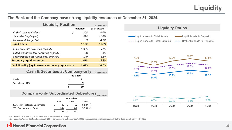Balance 305 838 9 % of Assets 4.0% 11.0% 0.1% Cash & cash equivalents Securities (unpledged) Loans available for Sale $ Liquid assets 1,152 15.0% Liquid Assets to Total Liabilities 17.1% 1,305 FHLB available borrowing capacity 0.4% 28 FRB discount window borrowing capacity 1.8% 140 Federal funds lines (unsecured) available 19.3% 1,473 Secondary liquidity sources 34.3% 2,625 Bank liquidity (liquid assets + secondary liquidity) $ Cash & Securities at Company - only ($ in millions Liquidity The Bank and the Company have strong liquidity resources at December 31, 2024. (1) Rate at December 31, 2024, based on 3 - month SOFR + 166 bps (2) Issued in August 2021 and due in July 2031. Commencing on September 1, 2026, the interest rate will reset quarterly to the three - month SOFR + 310 bps Liquidity Position ($ in millions) 14.9% 14.4% 15.0% 15.5% 15.1% 17.9% 16.8% 17.9% 18.5% 17.9% 16.6% 16.1% 16.8% 17.3% 16.9% 0.9% 0.7% 0.4% 0.2% 0.9% 4Q23 1Q24 2Q24 3Q24 4Q24 Liquid Assets to Total Assets Liquid Assets to Deposits Broker Deposits to Deposits Liquidity Ratios Par Amortized Cost Rate 6.02% (1) 3.75% (2) 2036 Trust Preferred Securitites 2031 Subordinated Debt $ 27 $ 22 110 109 $ 137 $ 131 Company - only Subordinated Debentures 36 ($ in millions) ) Balance Cash Securities (AFS) $ 11 39 $ 50