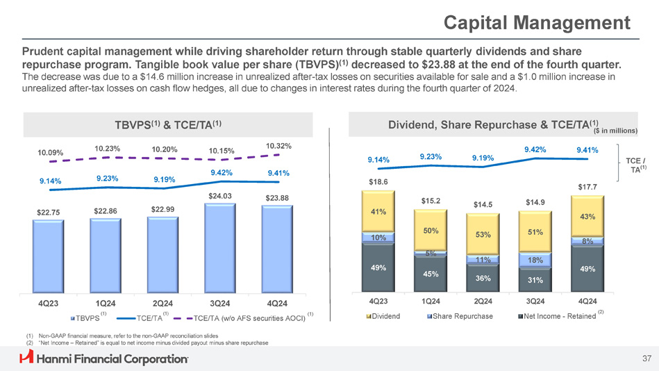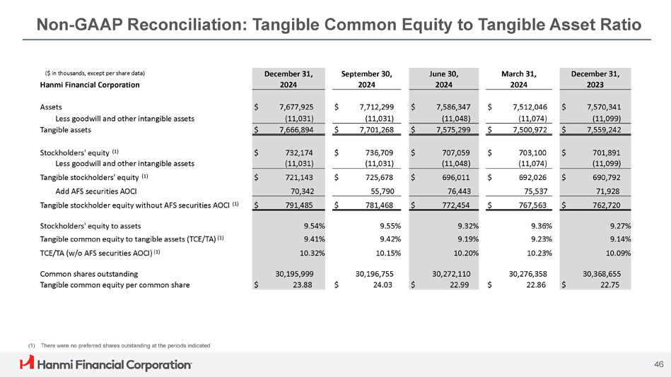 Non - GAAP Reconciliation: Tangible Common Equity to Tangible Asset Ratio 46 (1) There were no preferred shares outstanding at the periods indicated December 31, March 31, June 30, September 30, December 31, ($ in thousands, except per share data) 2023 2024 2024 2024 2024 Hanmi Financial Corporation $ 7,570,341 $ 7,512,046 $ 7,586,347 $ 7,712,299 $ 7,677,925 Assets (11,099) (11,074) (11,048) (11,031) (11,031) Less goodwill and other intangible assets $ 7,559,242 $ 7,500,972 $ 7,575,299 $ 7,701,268 $ 7,666,894 Tangible assets $ 701,891 $ 703,100 $ 707,059 $ 736,709 $ 732,174 Stockholders' equity (1) (11,099) (11,074) (11,048) (11,031) (11,031) Less goodwill and other intangible assets $ 690,792 $ 692,026 $ 696,011 $ 725,678 $ 721,143 Tangible stockholders' equity (1) 71,928 75,537 76,443 55,790 70,342 Add AFS securities AOCI $ 762,720 $ 767,563 $ 772,454 $ 781,468 $ 791,485 Tangible stockholder equity without AFS securities AOCI (1) 9.27% 9.36% 9.32% 9.55% 9.54% Stockholders' equity to assets 9.14% 9.23% 9.19% 9.42% 9.41% Tangible common equity to tangible assets (TCE/TA) (1) 10.09% 10.23% 10.20% 10.15% 10.32% TCE/TA (w/o AFS securities AOCI) (1) 30,368,655 30,276,358 30,272,110 30,196,755 30,195,999 Common shares outstanding $ 22.75 $ 22.86 $ 22.99 $ 24.03 $ 23.88 Tangible common equity per common share