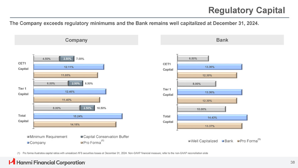 9.14% 9.23% 9.19% 9.42% 9.41% $22.75 $24.03 $23.88 4Q23 9.14% 9.42% 9.41% 10.09% 10.20% 10.23% 9.19% 9.23% $22.99 $22.86 10.15% 2Q24 (1) TCE/TA 3Q24 4Q24 (1) TCE/TA (w/o AFS securities AOCI) 1Q24 (1) TBVPS 10.32% 49% 45% 36% 31% 49% 10% 5% 11% 18% 8% 41% 50% 53% 51% 43% $18.6 $15.2 $14.5 $14.9 $17.7 3Q24 4Q24 (2) Net Income - Retained 4Q23 Dividend 1Q24 2Q24 Share Repurchase (1) Non - GAAP financial measure, refer to the non - GAAP reconciliation slides (2) “Net Income – Retained” is equal to net income minus divided payout minus share repurchase Capital Management Prudent capital management while driving shareholder return through stable quarterly dividends and share repurchase program. Tangible book value per share (TBVPS) (1) decreased to $23.88 at the end of the fourth quarter. The decrease was due to a $14.6 million increase in unrealized after - tax losses on securities available for sale and a $1.0 million increase in unrealized after - tax losses on cash flow hedges, all due to changes in interest rates during the fourth quarter of 2024. TBVPS (1) & TCE/TA (1) TCE / TA (1) Dividend, Share Repurchase & TCE/TA (1) 37 ($ in millions)