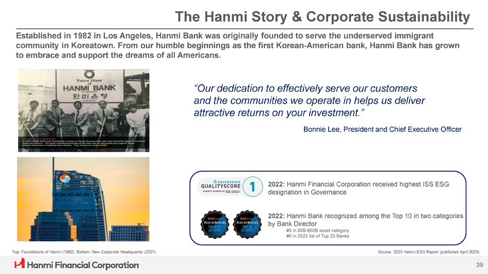 The Hanmi Story & Corporate Sustainability Established in 1982 in Los Angeles, Hanmi Bank was originally founded to serve the underserved immigrant community in Koreatown. From our humble beginnings as the first Korean - American bank, Hanmi Bank has grown to embrace and support the dreams of all Americans. “Our dedication to effectively serve our customers and the communities we operate in helps us deliver attractive returns on your investment.” Bonnie Lee, President and Chief Executive Officer 2022: Hanmi Financial Corporation received highest ISS ESG designation in Governance Top: Foundations of Hanmi (1982). Bottom: New Corporate Headquarter (2021) Source: 2023 Hanmi ESG Report (published April 2023) 39 2022: Hanmi Bank recognized among the Top 10 in two categories by Bank Director #3 in $5B - $50B asset category #6 in 2022 list of Top 25 Banks