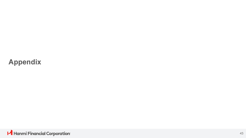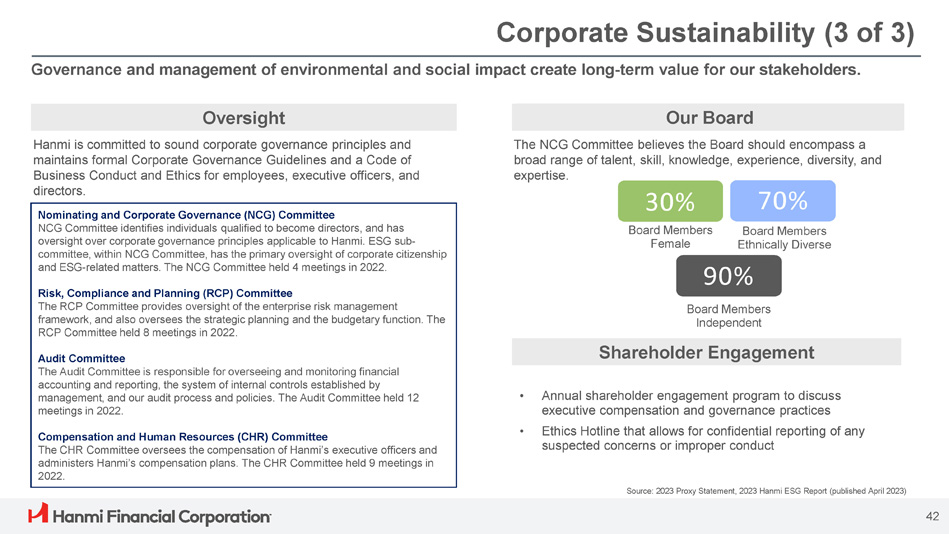 As a community bank, we are an equal opportunity employer and we are proud to work with our communities to build a stronger future for all of our stakeholders. Corporate Sustainability (2 of 3) Source: 2023 Hanmi ESG Report (published April 2023) Fostering Human Capital 68% Female Workforce 91% Ethnically Diverse Workforce 60% Female Managers 43% Current staff have been with us at least 5 years 13% Workforce promotions via Annual Review Hanmi Bank Dream Scholarship Provided Almost $1M in Scholarships Assisting 426 at - risk Students Across 12 States Serving Our Communities $7.5M Long - term commitment to a Community Reinvestment Act fund 289 Small business and community development loans Financial Wellness $380M Originated for small businesses and community development $300K+ Donated to non - profit partners Partnered with HoneyBee to provide financial wellness programs and Choice Checking account to meet the needs of the unbanked and underbanked. 41 (1) (1) Launched in 2016, the Hanmi Bank Dream Scholarship for At - Risk Youth Program provides educational support to at - risk students