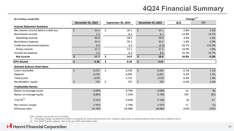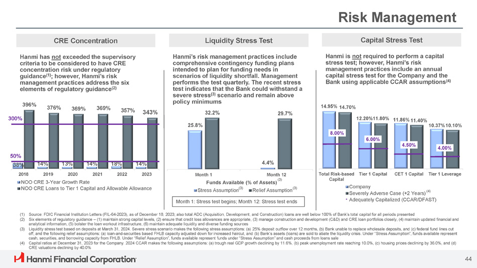 Risk Management CRE Concentration Hanmi has not exceeded the supervisory criteria to be considered to have CRE concentration risk under regulatory guidance (1) ; however, Hanmi’s risk management practices address the six elements of regulatory guidance (2) (1) Source: FDIC Financial Institution Letters (FIL - 64 - 2023), as of December 18, 2023; also total ADC (Acquisition, Development, and Construction) loans are well below 100% of Bank’s total capital for all periods presented (2) Six elements of regulatory guidance – (1) maintain strong capital levels, (2) ensure that credit loss allowances are appropriate, (3) manage construction and development (C&D) and CRE loan portfolios closely, (4) maintain updated financial and analytical information, (5) bolster the loan workout infrastructure, (6) maintain adequate liquidity and diverse funding sources (3) Liquidity stress test based on deposits at March 31, 2024. Severe stress scenario makes the following stress assumptions: (a) 25% deposit outflow over 12 months, (b) Bank unable to replace wholesale deposits, and (c) federal fund lines cut off, and the following relief assumptions: (a) loan - and - securities based FHLB capacity adjusted down for increased haircut, and (b) Bank’s assets (loans) are sold to abate the liquidity crisis. Under “Stress Assumption”, funds available represent cash, securities, and borrowing capacity from FHLB. Under “Relief Assumption”, funds available represent funds under “Stress Assumption” and cash proceeds from loans sale (4) Capital ratios at December 31, 2023 for the Company. 2024 CCAR makes the following assumptions: (a) trough real GDP growth declining by 11.6%, (b) peak unemployment rate reaching 10.0%, (c) housing prices declining by 36.0%, and (d) CRE valuations declining by 40.0% 38% 14% 13% 14% 18% 14% 396% 376% 369% 369% 357% 343% 300% 50% 2018 2019 2020 2021 2022 2023 NOO CRE 3 - Year Growth Rate NOO CRE Loans to Tier 1 Capital and Allowable Allowance Capital Stress Test Hanmi is not required to perform a capital stress test; however, Hanmi’s risk management practices include an annual capital stress test for the Company and the Bank using applicable CCAR assumptions (4) 14.95% 14.70% 12.20%11.80% 11.86% 11.40% 10.37%10.10% 8.00% 6.00% 4.50% 4.00% CET 1 Capital Tier 1 Leverage Total Risk - based Tier 1 Capital Capital Company Severely Adverse Case (+2 Years) Adequately Capitalized (CCAR/DFAST) Liquidity Stress Test Hanmi’s risk management practices include comprehensive contingency funding plans intended to plan for funding needs in scenarios of liquidity shortfall. Management performs the test quarterly. The recent stress test indicates that the Bank could withstand a severe stress (3) scenario and remain above policy minimums 25.8% 4.4% 32.2% 29.7% Month 1 Month 12 (3) Funds Available (% of Assets) Stress Assumption (3) Relief Assumption (3) 44 Month 1: Stress test begins; Month 12: Stress test ends (4)