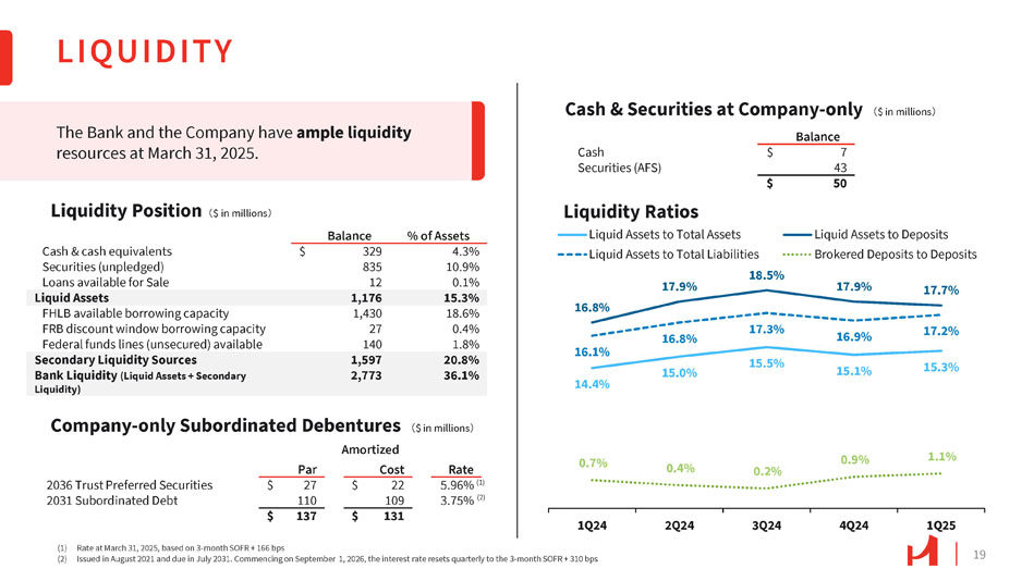 18 15 Year 68% 20 Year 20% SECURITIES PORTFOLIO $162 $205 $207 $129 $25 $26 $21 $15 $187 $231 $228 $144 2024 Actual 2027 2026 Interest 4% US Agy MBS - Residential 62% US Agy MBS - Commercial 14% US Agy CMO 8% Municipal 12% 9% US Agy 12% US Agy MBS - Residential 44% Municipal UST US Agy MBS - Commerical 7% US Agy CMO 8% 20% Available for Sale (1) $991 Million < 1 Year 10% 1 to 3 Year 21% 3 to 5 Years 44% > 5 Years 25% Unrealized Loss $84 Million US Agy Securities Duration 4.1 Years $439 Million 30 Year (2) 12% 2025 (3) Principal Note: Numbers may not add due to rounding (1) Based on the book value (2) 92% constitutes CRA bonds (3) 1Q25 observed $45.1 million of principle paydowns and $7.4 million of interest payments The $991 million securities portfolio (all AFS, no HTM) represented 13% of assets at March 31, 2025, and had a weighted average modified duration of 4.1 years with a $84 million in an unrealized loss position. Principal Paydowns 㸦 $ in millions 㸧 US Agy Residential MBS (Maturity)