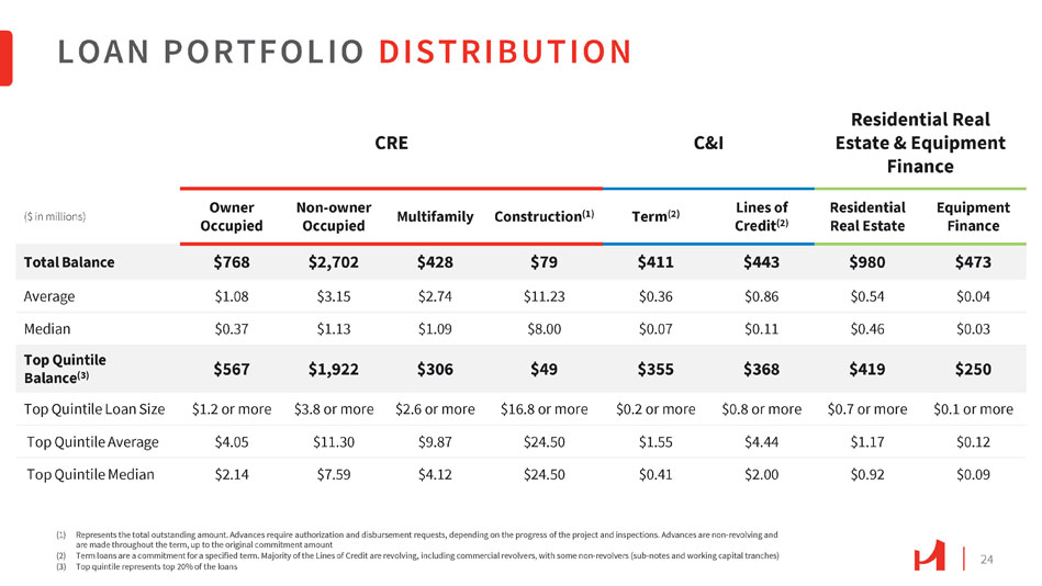 California $2,564 64% New York $251 6% Texas $390 10% Illinois $103 3% Other $668 17% CRE Composition by State $3,975 ($ in millions) CRE PORTFOLIO GEOGRAPHICAL EXPOSURE 23 California $38 50% New York $17 22% Other $23 28% Construction by State $78 California $434 57% Texas $51 7% New York $8 1% Illinois $13 2% Other $262 33% Owner Occupied by State $768 California $1,866 69% Texas $238 9% $152 6% Illinois $79 3% New York Other $367 13% Investor (Non - owner Occupied) by State $2,702 California $226 53% Texas $101 24% New York $74 17% Other $15 3% Multifamily by State $428 Illinois $12 3%