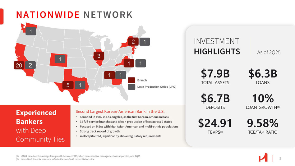 Second Largest Korean - American Bank in the U.S. • Founded in 1982 in Los Angeles, as the first Korean - American bank • 32 full - service branches and 8 loan production offices across 9 states • Focused on MSAs with high Asian - American and multi - ethnic populations • Strong track record of growth • Well capitalized, significantly above regulatory requirements Experienced Bankers with Deep Community Ties 3 1 1 1 1 5 1 NATIONWIDE NETWORK 1 2 Branch Loan Production Office (LPO) 1 20 2 TOTAL ASSETS $6.3B LOANS $6.7B DEPOSITS 10% LOAN GROWTH (1) 9.58% TCE/TA (2) RATIO $24.91 TBVPS (2) INVESTMENT HIGHLIGHTS $7.9B As of 2Q25 (1) CAGR based on the average loan growth between 2013, when new executive management was appointed, and 2Q25 (2) Non - GAAP financial measure; refer to the non - GAAP reconciliation slide 5 1