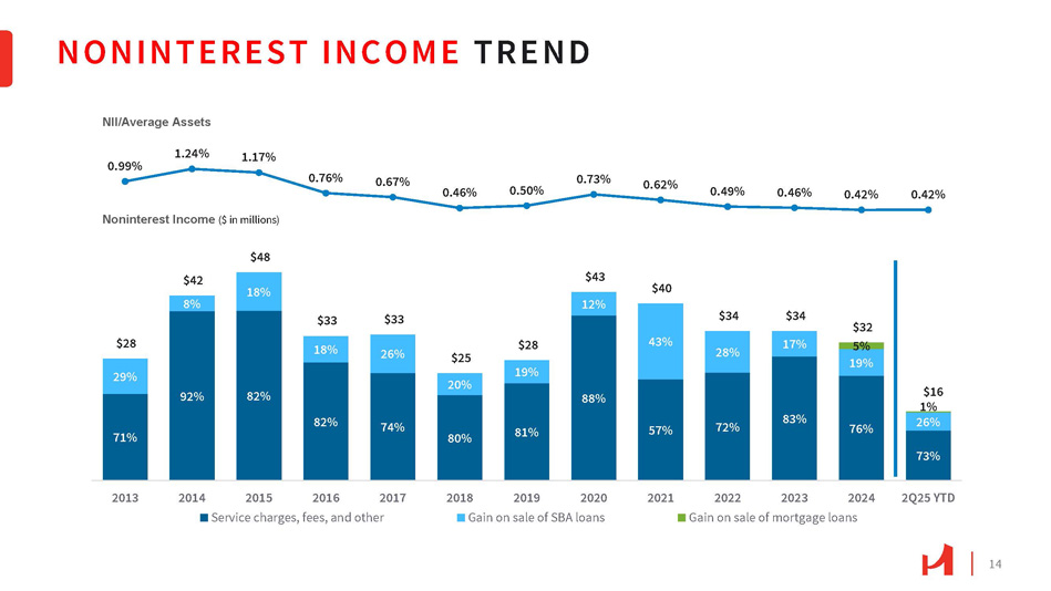 NET INTEREST INCOME & NIM TREND NIM 3.94% Net Interest Income ($ in millions) $109 $123 $160 $148 $177 $181 $176 $181 $195 $238 $221 $203 $112 3.88% 3.90% 3.95% 3.82% 3.57% 3.37% 3.19% 3.08% 3.50% 3.08% 2.78% 3.05% 2013 2014 2015 2016 2017 2018 2019 2020 2021 2022 2023 2024 2Q25 YTD 13