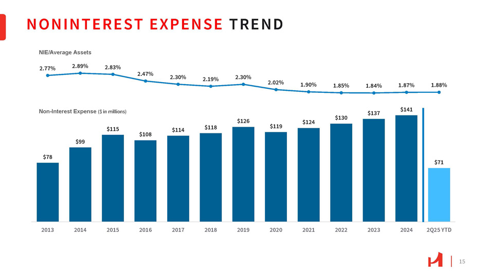 NONINTEREST INCOME TREND NII/Average Assets 71% 92% 82% 82% 74% 80% 81% 88% 57% 72% 83% 76% 73% 29% 8% 18% 12% 43% 28% 17% 19% 26% 5% $28 $42 Noninterest Income ($ in millions) $48 $33 18% $33 26% $25 20% $28 19% $43 $40 $34 $34 $32 $16 1% 0.99% 1.24% 1.17% 0.76% 0.67% 0.46% 0.50% 0.73% 0.62% 0.49% 0.46% 0.42% 0.42% 2013 2014 2015 2016 2017 Service charges, fees, and other 2021 2022 2023 2024 2Q25 YTD Gain on sale of mortgage loans 2018 2019 2020 Gain on sale of SBA loans 14