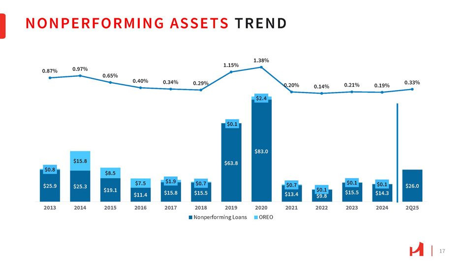 NONPERFORMING ASSETS TREND NPAs/Total Assets Nonperforming Assets ($ in millions) $63.8 $83.0 $9.8 $14.3 $0.8 $15.8 $8.5 $0.1 $2.4 0.87% 0.97% 0.65% 0.40% 0.34% 0.29% 1.15% 1.38% 0.20% 0.14% 0.21% 0.19% 0.33% $26.0 $0.1 $0.1 $15.5 $0.1 $0.7 $13.4 $0.7 $15.5 $1.9 $15.8 $7.5 $11.4 $19.1 $25.3 $25.9 2Q25 2024 2023 2022 2021 2020 2019 2018 2017 2016 2015 2014 2013 Nonperforming Loans OREO 17
