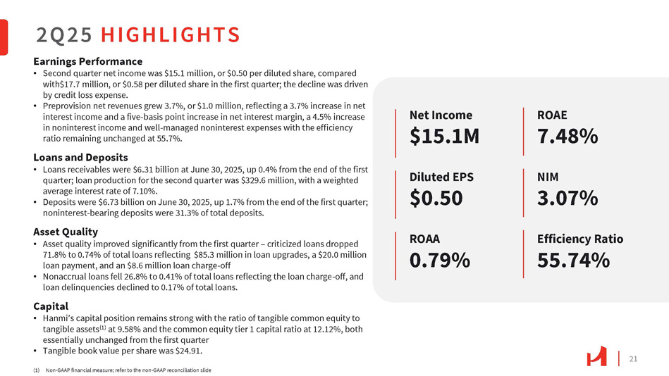 TABLE OF CONTENTS HANMI PROFILE 5 – 20 2Q25 PERFORMANCE RESULTS 21 – 37 LOAN PORTFOLIO DETAILS 2Q25 FINANCIAL SUMMARY NON - GAAP RECONCILIATION 49 – 50 38 – 47 48 – 48 2