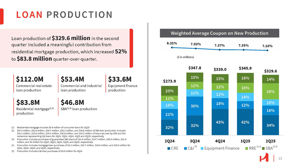 LOAN PRODUCTION Loan production of $329.6 million in the second quarter included a meaningful contribution from residential mortgage production, which increased 52% to $83.8 million quarter - over - quarter. (1) Residential mortgage includes $0.9 million of consumer loans for 2Q25 (2) $54.5 million, $51.6 million, $49.7 million, $55.2 million, and $46.8 million of SBA loan production includes $31.4 million, $25.6 million, $15.4 million, $30.8 million, and $23.3 million of loans secured by CRE and the remainder representing C&I loans for 2Q24, 3Q24, 4Q24, 1Q25 and 2Q25, respectively (3) Production includes purchases of guaranteed SBA loans of $14.5 million, $13.7 million, $20.3 million, $11.0 million, and $0 million for 2Q24, 3Q24, 4Q24, 1Q25, and 2Q25, respectively (4) Production includes mortgage loan purchases of $5.2 million, $10.7 million, $10.0 million, and $10.3 million for 2Q24, 3Q24, 1Q25, and 2Q25, respectively (5) Production includes C&I loan purchases of $0.6 million for 4Q24 $112.0M Commercial real estate loan production $53.4M Commercial and industrial loan production $33.6M Equipment finance production $83.8M Residential mortgage (1,4) production $46.8M SBA (2,3) loan production 32% 32% 43% 42% 34% 30% 10% 16% 26% $273.9 20% 11% 16% 21% $347.8 15% 12% 11% $339.0 15% 12% 12% 18% $345.9 16% 16% 14% 12% $329.6 14% 3Q24 2Q25 2Q24 CRE C&I 4Q24 1Q25 Equipment Finance RRE SBA Weighted Average Coupon on New Production 8.31% 7.92% 7.37% 7.35% 7.10% ($ in millions) (2,3) (1,4) (5) 22