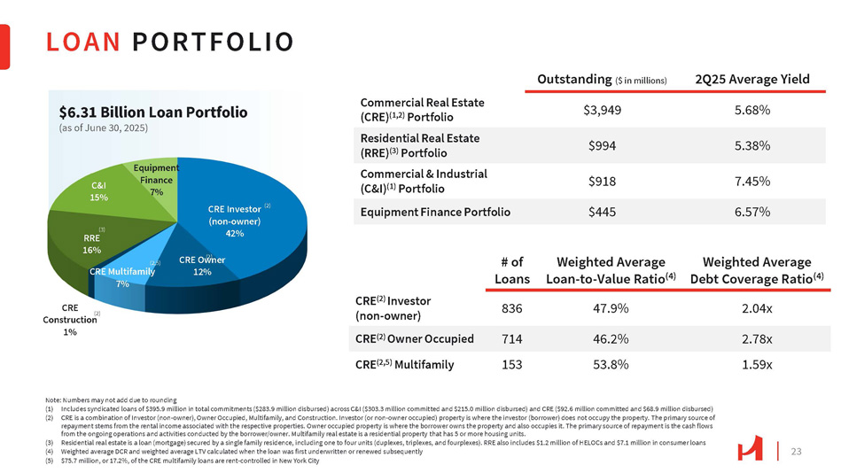 CRE (5) $75.7 million, or 17.2%, of the CRE multifamily loans are rent - controlled in New York City Construction 1% C&I 15% Equipment Finance 7% (2) (2,5) CRE Multifamily 7% CRE O w (2 ) n er 12% CRE Investor (2) (non - owner) 42% (3) RRE 16% $6.31 Billion Loan Portfolio (as of June 30, 2025) LOAN PORTFOLIO 23 Note: Numbers may not add due to rounding (1) Includes syndicated loans of $395.9 million in total commitments ($283.9 million disbursed) across C&I ($303.3 million committed and $215.0 million disbursed) and CRE ($92.6 million committed and $68.9 million disbursed) (2) CRE is a combination of Investor (non - owner), Owner Occupied, Multifamily, and Construction. Investor (or non - owner occupied) property is where the investor (borrower) does not occupy the property. The primary source of repayment stems from the rental income associated with the respective properties. Owner occupied property is where the borrower owns the property and also occupies it. The primary source of repayment is the cash flows from the ongoing operations and activities conducted by the borrower/owner. Multifamily real estate is a residential property that has 5 or more housing units. (3) Residential real estate is a loan (mortgage) secured by a single family residence, including one to four units (duplexes, triplexes, and fourplexes). RRE also includes $1.2 million of HELOCs and $7.1 million in consumer loans (4) Weighted average DCR and weighted average LTV calculated when the loan was first underwritten or renewed subsequently 2Q25 Average Yield Outstanding ($ in millions) 5.68% $3,949 Commercial Real Estate (CRE) (1,2) Portfolio 5.38% $994 Residential Real Estate (RRE) (3) Portfolio 7.45% $918 Commercial & Industrial (C&I) (1) Portfolio 6.57% $445 Equipment Finance Portfolio Weighted Average Debt Coverage Ratio (4) Weighted Average Loan - to - Value Ratio (4) # of Loans 2.04x 47.9% 836 CRE (2) Investor (non - owner) 2.78x 46.2% 714 CRE (2) Owner Occupied 1.59x 53.8% 153 CRE (2,5) Multifamily