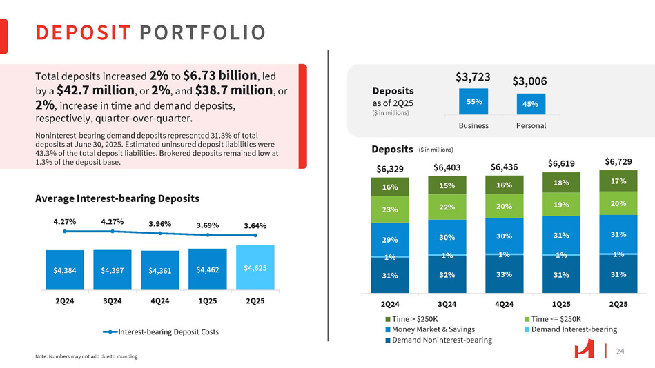 $4,625 $4,462 $4,361 $4,397 $4,384 2Q25 1Q25 4Q24 3Q24 2Q24 4.27% 4.27% 3.96% 3.69% 3.64% Interest - bearing Deposit Costs Average Interest - bearing Deposits DEPOSIT PORTFOLIO Total deposits increased 2% to $6.73 billion , led by a $42.7 million , or 2% , and $38.7 million , or 2% , increase in time and demand deposits, respectively, quarter - over - quarter. Noninterest - bearing demand deposits represented 31.3% of total deposits at June 30, 2025. Estimated uninsured deposit liabilities were 43.3% of the total deposit liabilities. Brokered deposits remained low at 1.3% of the deposit base. Note: Numbers may not add due to rounding 29% 30% 30% 23% Deposits $6,329 16% $6,436 $6,403 16% 15% 20% 22% $6,729 $6,619 17% 18% 20% 19% 31% 31% 1% 1% 1% 1% 1% 31% 31% 33% 31% 32% 2Q25 1Q25 4Q24 2Q24 3Q24 Time > $250K Money Market & Savings Demand Noninterest - bearing Time <= $250K Demand Interest - bearing ($ in millions) Deposits as of 2Q25 ($ in millions) Business Personal $3,006 45% $3,723 55% 24