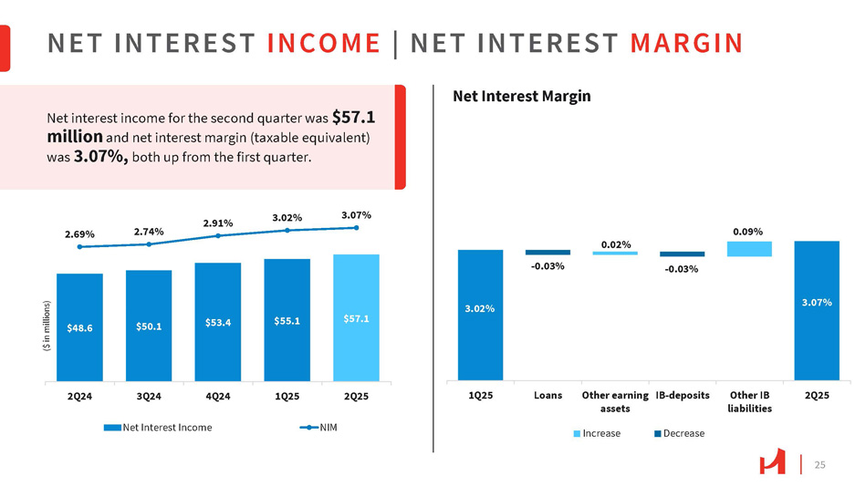 25 $48.6 $50.1 $53.4 $55.1 $57.1 2.69% 2.74% 2.91% 3.02% 3.07% 2Q24 3Q24 4Q24 Net Interest Income 1Q25 2Q25 NIM NET INTEREST INCOME | NET INTEREST MARGIN ($ in millions) 3.02% - 0.03% 0.02% - 0.03% 0.09% 3.07% 1Q25 Loans Other IB liabilities 2Q25 Other earning IB - deposits assets Increase Decrease Net interest income for the second quarter was $ 57 . 1 million and net interest margin (taxable equivalent) was 3 . 07 % , both up from the first quarter . Net Interest Margin