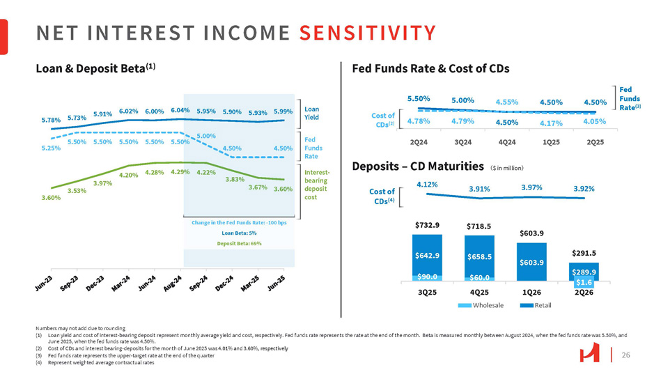 26 5.78% 5.73% 5.91% 6.02% 6.00% 6.04% 5.95% 5.90% 5.93% 5.99% 3.60% 3.53% 3.97% 4.20% 4.28% 4.29% 4.22% 3.83% 3.67% 3.60% 5.25% 5.50% 5.50% 5.50% 5.50% 5.50% 5.00% 4.50% 4.50% NET INTEREST INCOME SENSITIVITY $90.0 $60.0 $642.9 $658.5 $603.9 $732.9 $718.5 $603.9 $291.5 $289.9 4.12% 3.91% 3.97% 3.92% 3Q25 $1.6 2Q26 4Q25 Wholesale 1Q26 Retail 5.50% 5.00% 4.50% 4.50% 4.50% 4.78% 4.79% 4.55% 4.17% 4.05% 2Q24 3Q24 4Q24 Deposits – CD Maturities 㸦 $ in million 㸧 1Q25 2Q25 Fed Funds Rate (3) Cost of CDs (2) Cost of CDs (4) Numbers may not add due to rounding (1) Loan yield and cost of interest - bearing deposit represent monthly average yield and cost, respectively. Fed funds rate represents the rate at the end of the month. Beta is measured monthly between August 2024, when the fed funds rate was 5.50%, and June 2025, when the fed funds rate was 4.50%. (2) Cost of CDs and interest bearing - deposits for the month of June 2025 wa s 4.01% and 3.60%, respectively (3) Fed funds rate represents the upper - target rate at the end of the quarter (4) Represent weighted average contractual rates Fed Funds Rate Interest - bearing deposit cost Loan Yield Change in the Fed Funds Rate: - 100 bps Loan Beta: 5% Deposit Beta: 69% Loan & Deposit Beta (1) Fed Funds Rate & Cost of CDs