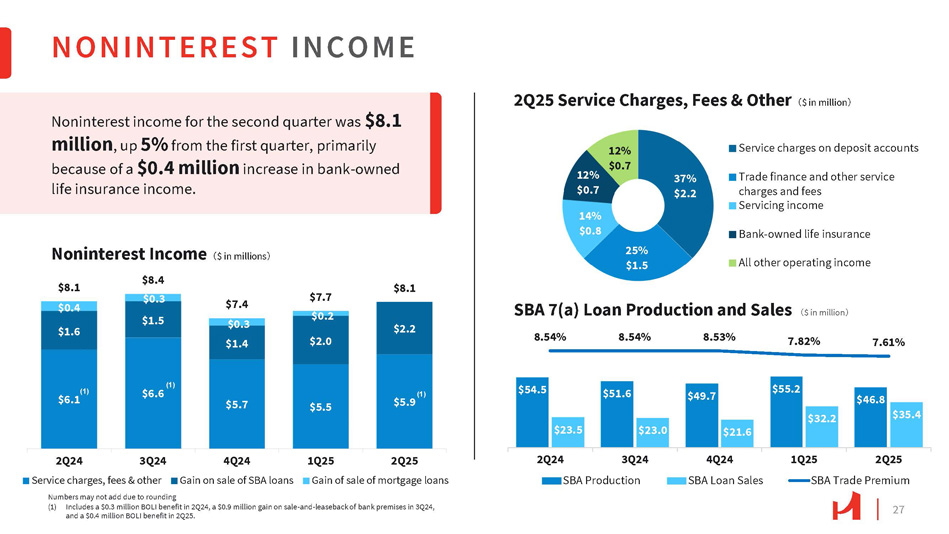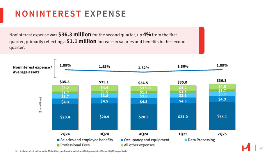 27 37% $2.2 25% $1.5 12% $0.7 14% $0.8 12% $0.7 Service charges on deposit accounts Trade finance and other service charges and fees Servicing income Bank - owned life insurance All other operating income NONINTEREST INCOME $54.5 $51.6 $49.7 $55.2 $46.8 $23.5 $23.0 $21.6 $32.2 $35.4 8.54% 8.54% 8.53% 7.82% 7.61% 2Q24 3Q24 SBA Production 4Q24 SBA Loan Sales 1Q25 2Q25 SBA Trade Premium $6.1 $6.6 $5.7 $5.5 $2.2 $0.3 $1.5 $8.1 $0.4 $1.6 $7.4 $0.3 $1.4 $7.7 $0.2 $2.0 $8.1 2Q24 3Q24 Service charges, fees & other 4Q24 Gain on sale of SBA loans 1Q25 2Q25 Gain of sale of mortgage loans Noninterest Income 㸦 $ in millions 㸧 $8.4 Numbers may not add due to rounding (1) Includes a $0.3 million BOLI benefit in 2Q24, a $0.9 million gain on sale - and - leaseback of bank premises in 3Q24, and a $0.4 million BOLI benefit in 2Q25. Noninterest income for the second quarter was $8.1 million , up 5% from the first quarter, primarily because of a $0.4 million increase in bank - owned life insurance income. 2Q25 Service Charges, Fees & Other 㸦 $ in million 㸧 SBA 7(a) Loan Production and Sales 㸦 $ in million 㸧 (1) (1) (1) $5.9