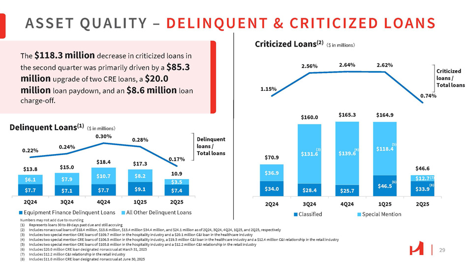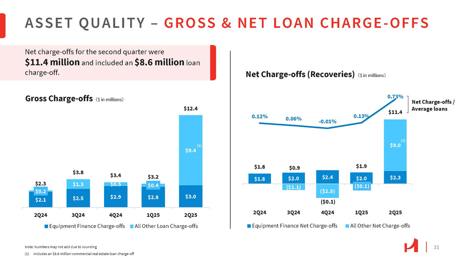 30 Nonperforming assets were $26.0 million at the end of the second quarter, down from $35.5 million at the end of the fourth quarter. The decrease was primarily driven by an $8.6 million charge - off on a commercial real estate loan designated as nonaccrual during the first quarter of 2025. $19.2 $15.5 $14.3 $35.6 $26.0 $0.8 $0.8 $0.1 $0.1 $20.0 $16.3 $14.4 $35.7 $26.0 1Q25 2Q25 2Q24 3Q24 4Q24 Nonperforming loans Note: Numbers may not add due to rounding OREO ASSET QUALITY – NONPERFORMING ASSETS & NONACCRUAL LOANS (1) Nonperforming assets exclude repossessed personal property of $1.2 million, $1.2 million, $0.6 million, $0.7 million, and $0.6 million for 2Q24, 3Q24, 4Q24, 1Q25, and 2Q25, respectively; also excludes the $27.2 million held for sale nonperforming loan at 3Q24. (2) Specific allowance for credit losses for 2Q24, 3Q24, 4Q24, 1Q25, and 2Q25 was $6.8 million, $5.2 million, $6.2 million, $11.8 million, and $4.1 million, respectively (3) RRE includes consumer loans (4) Represents a $11.0 million CRE loan at June 30, 2025 $9.6 $8.8 $8.2 $7.0 $4.5 $2.8 $4.0 $4.0 $20.0 $11.0 $15.2 $3.7 $1.9 $35.5 (2) 4Q24 2Q24 3Q24 Equipment Finance All other CRE and C&I < $3M $19.2 (2) $3.9 $5.9 $0.8 $8.6 (2) $26.0 (2) $14.3 (2) $3.6 $1.9 1Q25 2Q25 RRE (3) All other CRE and C&I >= $3M (4) Nonperforming Assets (1) 㸦 $ in millions 㸧 0.26% 0.21% 0.19% 0.46% 0.33% Nonperforming assets / Total assets Nonaccrual Loans 㸦 $ in millions 㸧