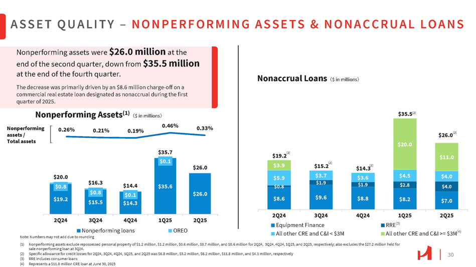 29 $7.7 $10.7 $13.8 $6.1 $7.7 $15.0 $7.9 $7.1 $18.4 $17.3 $8.2 $9.1 10.9 $3.5 $7.4 0.22% 0.24% 0.28% 0.17% 1Q25 2Q25 All Other Delinquent Loans 2Q24 3Q24 4Q24 Equipment Finance Delinquent Loans Numbers may not add due to rounding ASSET QUALITY – DELINQUENT & CRITICIZED LOANS Delinquent loans / Total loans $34.0 $28.4 $25.7 $46.5 $36.9 $131.6 $139.6 $118.4 $70.9 $160.0 $165.3 $164.9 $46.6 1.15% 2.56% 2.64% 2.62% 0.74% 2Q24 3Q24 Classified 4Q24 1Q25 Special Mention 2Q25 Criticized loans / Total loans (1) Represents loans 30 to 89 days past due and still accruing (2) Includes nonaccrual loans of $18.4 million, $13.6 million, $13.4 million $34.4 million, and $24.1 million as of 2Q24, 3Q24, 4Q24, 1Q25, and 2Q25, respectively (3) Includes two special mention CRE loans of $109.7 million in the hospitality industry and a $20.1 million C&I loan in the healthcare industry (4) Includes two special mention CRE loans of $106.5 million in the hospitality industry, a $19.5 million C&I loan in the healthcare industry and a $12.4 million C&I relationship in the retail industry (5) Includes two special mention CRE loans of $105.8 million in the hospitality industry and a $12.2 million C&I relationship in the retail industry (6) Includes $20.0 million CRE loan designated nonaccrual at March 31, 2025 (7) Includes $12.2 million C&I relationship in the retail industry (8) Includes $11.0 million CRE loan designated nonaccrual at June 30, 2025 Delinquent Loans (1) 㸦 $ in millions 㸧 0.30% (3) (4) The $118.3 million decrease in criticized loans in the second quarter was primarily driven by a $85.3 million upgrade of two CRE loans, a $20.0 million loan paydown, and an $8.6 million loan charge - off. Criticized Loans (2) 㸦 $ in millions 㸧 (5) (6) $12.7 (7) $33.9 (8)