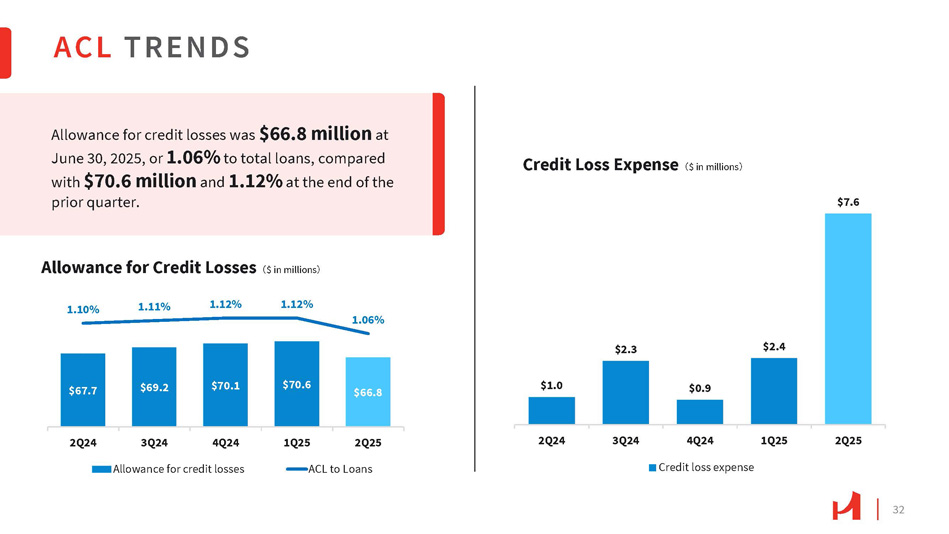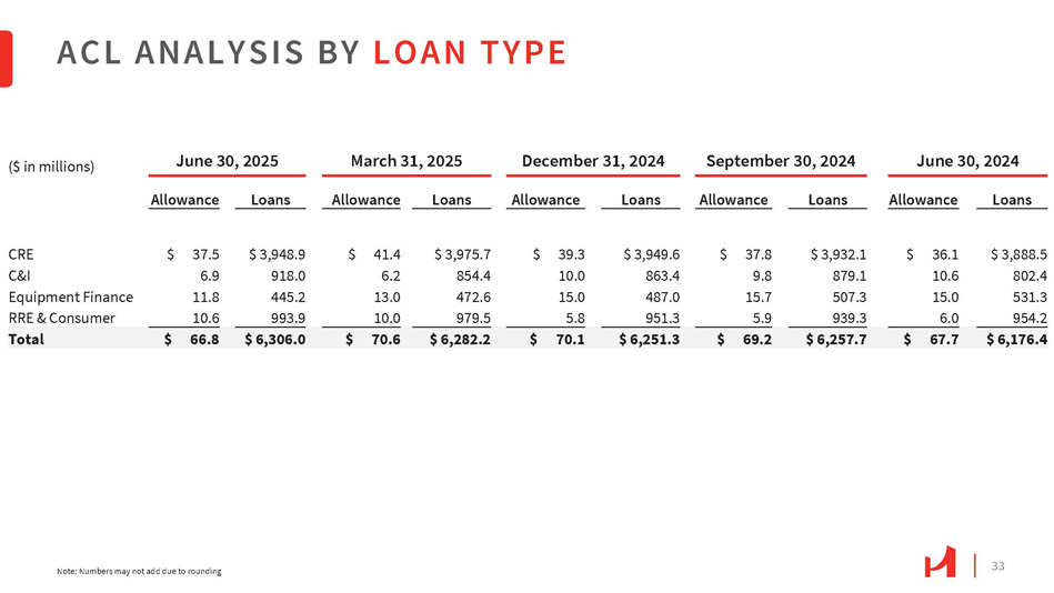 32 ACL TRENDS $66.8 $70.6 $70.1 $69.2 $67.7 2Q25 1Q25 4Q24 3Q24 2Q24 1.10% 1.11% 1.12% 1.12% 1.06% Allowance for credit losses ACL to Loans $1.0 $2.3 $0.9 $2.4 $7.6 2Q24 3Q24 4Q24 Credit loss expense 1Q25 2Q25 Allowance for credit losses was $ 66 . 8 million at June 30 , 2025 , or 1 . 06 % to total loans, compared with $ 70 . 6 million and 1 . 12 % at the end of the prior quarter . Allowance for Credit Losses 㸦 $ in millions 㸧 Credit Loss Expense 㸦 $ in millions 㸧