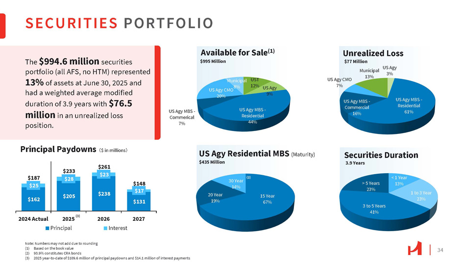34 15 Year 67% 20 Year 19% SECURITIES PORTFOLIO $162 $205 $238 $131 $25 $28 $23 $17 $187 $233 $261 $148 2024 Actual 2027 2026 Interest 3% US Agy MBS - Residential 61% US Agy MBS - Commercial 16% US Agy CMO 7% Municipal 13% UST 12% US Agy 9% US Agy MBS - Residential 44% US Agy MBS - Commerical 7% US Agy CMO 20% Municipal 8% Available for Sale (1) $995 Million < 1 Year 13% 1 to 3 Year 23% 3 to 5 Years 41% > 5 Years 23% Unrealized Loss $77 Million US Agy Securities Duration 3.9 Years $435 Million (2) 30 Year 14% 2025 (3) Principal Note: Numbers may not add due to rounding (1) Based on the book value (2) 93.9% constitutes CRA bonds (3) 2025 year - to - date of $109.6 million of principal paydowns and $14.1 million of interest payments The $994.6 million securities portfolio (all AFS, no HTM) represented 13% of assets at June 30, 2025 and had a weighted average modified duration of 3.9 years with $76.5 million in an unrealized loss position. Principal Paydowns 㸦 $ in millions 㸧 US Agy Residential MBS (Maturity)
