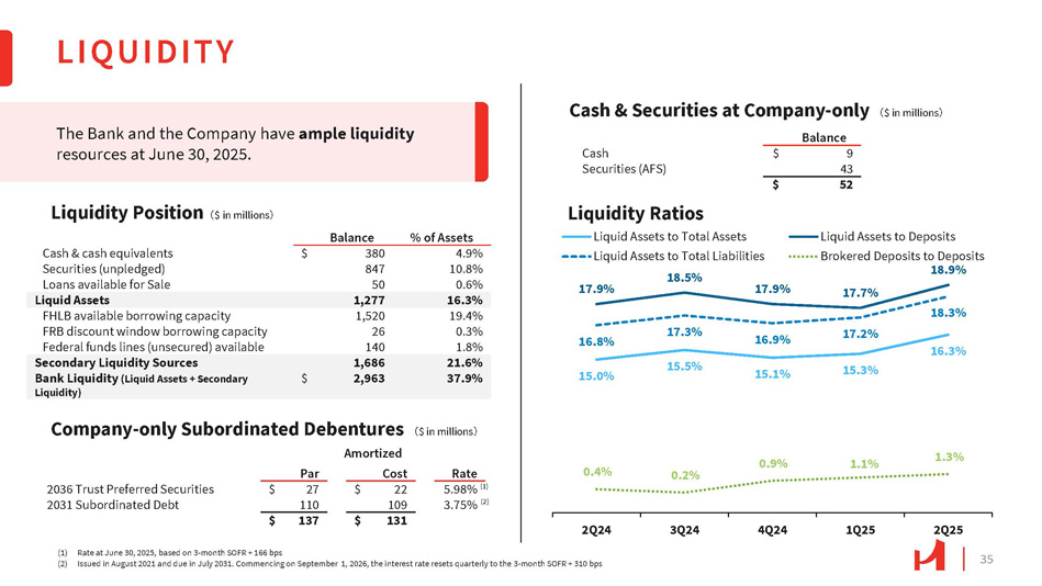 35 LIQUIDITY (1) Rate at June 30, 2025, based on 3 - month SOFR + 166 bps (2) Issued in August 2021 and due in July 2031. Commencing on September 1, 2026, the interest rate resets quarterly to the 3 - month SOFR + 310 bps 15.0% 15.5% 15.1% 18.5% 17.9% 17.9% 16.8% 17.3% 16.9% Liquid Assets to Deposits Brokered Deposits to Deposits 18.9% 17.7% 18.3% 17.2% 16.3% 15.3% 0.4% 0.2% 0.9% 1.1% 1.3% 2Q24 3Q24 4Q24 1Q25 2Q25 Liquid Assets to Total Assets Liquid Assets to Total Liabilities Liquidity Position 㸦 $ in millions 㸧 Cash & Securities at Company - only 㸦 $ in millions 㸧 Company - only Subordinated Debentures 㸦 $ in millions 㸧 Liquidity Ratios % of Assets Balance 4.9% 380 $ Cash & cash equivalents 10.8% 847 Securities (unpledged) 0.6% 50 Loans available for Sale 16.3% 1,277 Liquid Assets 19.4% 1,520 FHLB available borrowing capacity 0.3% 26 FRB discount window borrowing capacity 1.8% 140 Federal funds lines (unsecured) available 21.6% 1,686 Secondary Liquidity Sources 37.9% 2,963 $ Bank Liquidity (Liquid Assets + Secondary Liquidity) Balance 9 $ Cash 43 Securities (AFS) 52 $ Amortized Rate Cost Par 5.98% 22 $ 27 $ 2036 Trust Preferred Securities 3.75% 109 110 2031 Subordinated Debt 131 $ 137 $ The Bank and the Company have ample liquidity resources at June 30, 2025. (1) (2)