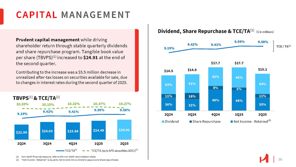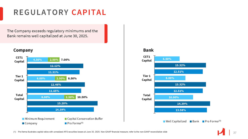 36 31% 49% 48% 11% 36% 18% 8% 6% 11% 35% 53% 51% 43% 46% 54% $14.5 $14.9 $17.7 $17.7 $15.1 2Q24 Dividend 3Q24 4Q24 Share Repurchase 1Q25 2Q25 Net Income - Retained (2) 9.19% 10.20% 10.15% 9.42% 10.32% 9.41% 10.37% 9.59% 10.27% 9.58% TCE/TA (1) TCE/TA (w/o AFS securities AOCI) (1) (1) Non - GAAP financial measure, refer to the non - GAAP reconciliation slides (2) “Net Income – Retained” is equal to net income minus dividend payout and share repurchases $24.49 $24.91 $23.88 $22.99 $24.03 1Q25 2Q25 4Q24 2Q24 3Q24 9.19% 9.42% 9.41% 9.59% 9.58% CAPITAL MANAGEMENT TCE / TA (1) Prudent capital management while driving shareholder return through stable quarterly dividends and share repurchase program. Tangible book value per share (TBVPS) (1) increased to $24.91 at the end of the second quarter. Contributing to the increase was a $5.5 million decrease in unrealized after - tax losses on securities available for sale, due to changes in interest rates during the second quarter of 2025. TBVPS (1) & TCE/TA (1) Dividend, Share Repurchase & TCE/TA (1) 㸦 $ in millions 㸧