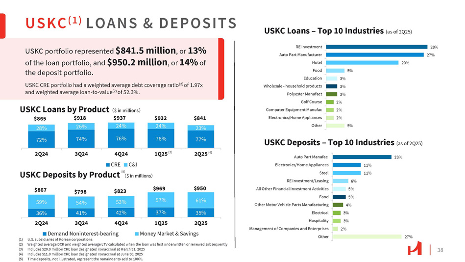 38 USKC ( 1 ) LOANS & DEPOSITS USKC portfolio represented $ 841 . 5 million , or 13 % of the loan portfolio, and $ 950 . 2 million , or 14 % of the deposit portfolio . USKC CRE portfolio had a weighted average debt coverage ratio ( 2 ) of 1 . 97 x and weighted average loan - to - value ( 2 ) of 52 . 3 % . USKC Loans – Top 10 Industries (as of 2Q25) 28% RE Investment 27% 20% 5% 3% Auto Part Manufacturer Hotel Food Education 3% Wholesale - household products 3% Polyester Manufact 2% Golf Course 2% Computer Equipment Manufac 5% 2% Electronics/Home Appliances Other 23% 11% 11% 6% 5% 5% 2% 4% Other Motor Vehicle Parts Manufacturing 3% Electrical 3% Hospitality 27% Auto Part Manufac Electronics/Home Appliances Steel RE Investment/Leasing All Other Financial Investment Activities Food Management of Companies and Enterprises Other USKC Deposits – Top 10 Industries (as of 2Q25) $865 28% 72% $918 26% 74% $937 24% 76% $932 24% 76% $841 23% 77% 2Q24 3Q24 4Q24 CRE C&I USKC Loans by Product 㸦 $ in millions 㸧 1Q25 (3) 2Q25 (4) USKC Deposits by Product 㸦 $ in millions 㸧 $867 $798 $823 61% 57% 53% 54% 59% 35% 37% 42% 41% 36% 2Q25 1Q25 4Q24 3Q24 2Q24 $969 $950 Demand Noninterest - bearing Money Market & Savings (1) U.S. subsidiaries of Korean corporations (2) Weighted average DCR and weighted average LTV calculated when the loan was first underwritten or renewed subsequently (3) Includes $20.0 million CRE loan designated nonaccrual at March 31, 2025 (4) Includes $11.0 million CRE loan designated nonaccrual at June 30, 2025 (5) Time deposits, not illustrated, represent the remainder to add to 100%. (5)