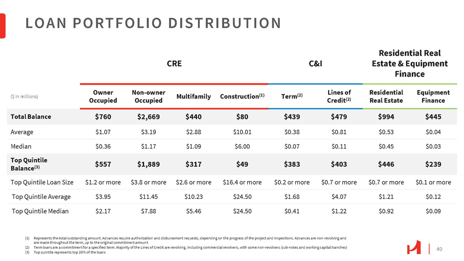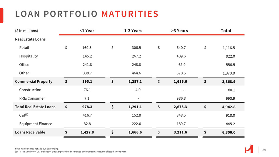 39 Total >3 Years 1 - 3 Years <1 Year ($ in millions) Real Estate Loans 1,116.5 $ 640.7 $ 306.5 $ 169.3 $ Retail 822.0 409.6 267.2 145.2 Hospitality 556.5 65.9 248.8 241.8 Office 1,373.8 570.5 464.6 338.7 Other 3,868.9 $ 1,686.6 $ 1,287.1 $ 895.1 $ Commercial Property 80.1 - 4.0 76.1 Construction 993.9 986.8 - 7.1 RRE/Consumer 4,942.8 $ 2,673.3 $ 1,291.1 $ 978.3 $ Total Real Estate Loans 918.0 348.5 152.8 416.7 C&I (1) 445.2 189.7 222.6 32.8 Equipment Finance 6,306.0 $ 3,211.6 $ 1,666.6 $ 1,427.8 $ Loans Receivable LOAN PORTFOLIO MATURITIES Note: numbers may not add due to rounding (1) $388.1 million of C&I are lines of credit expected to be renewed and maintain a maturity of less than one year