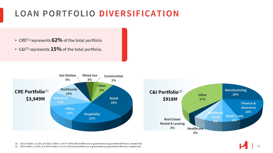40 LOAN PORTFOLIO DISTRIBUTION Residential Real Estate & Equipment Finance C&I CRE Equipment Finance Residential Real Estate Lines of Credit (2) Term (2) Construction (1) Multifamily Non - owner Occupied Owner Occupied ($ in millions) $445 $994 $479 $439 $80 $440 $2,669 $760 Total Balance $0.04 $0.53 $0.81 $0.38 $10.01 $2.88 $3.19 $1.07 Average $0.03 $0.45 $0.11 $0.07 $6.00 $1.09 $1.17 $0.36 Median $239 $446 $403 $383 $49 $317 $1,889 $557 Top Quintile Balance (3) $0.1 or more $0.7 or more $0.7 or more $0.2 or more $16.4 or more $2.6 or more $3.8 or more $1.2 or more Top Quintile Loan Size $0.12 $1.21 $4.07 $1.68 $24.50 $10.23 $11.45 $3.95 Top Quintile Average $0.09 $0.92 $1.22 $0.41 $24.50 $5.46 $7.88 $2.17 Top Quintile Median (1) Represents the total outstanding amount. Advances require authorization and disbursement requests, depending on the progress of the project and inspections. Advances are non - revolving and are made throughout the term, up to the original commitment amount (2) Term loans are a commitment for a specified term. Majority of the Lines of Credit are revolving, including commercial revolvers, with some non - revolvers (sub - notes and working capital tranches) (3) Top quintile represents top 20% of the loans