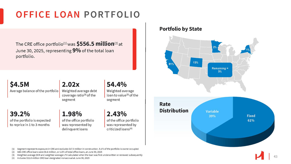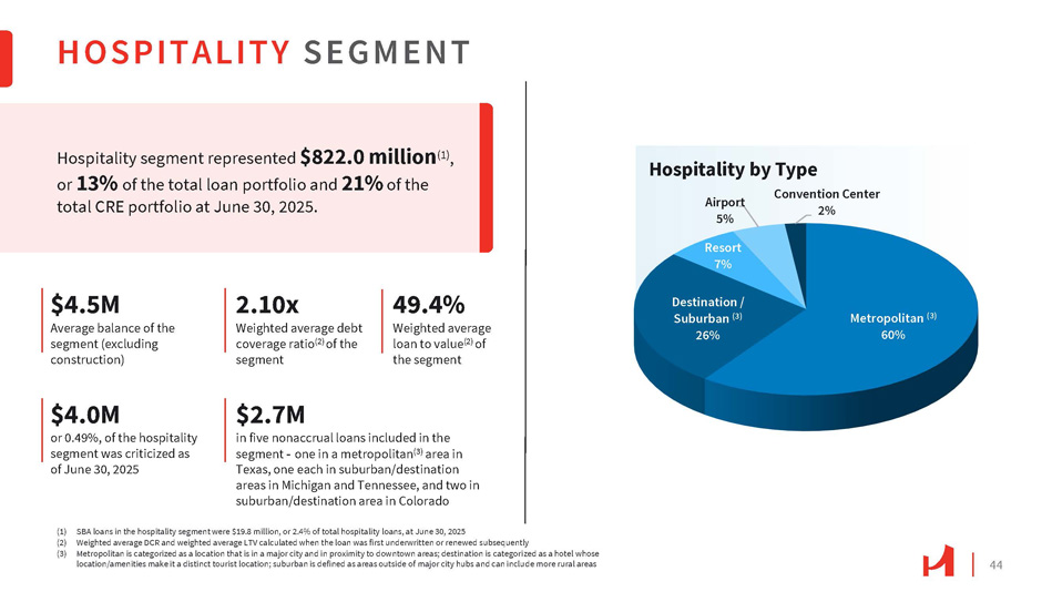 Rate Distribution Portfolio by State Fixed 61% Variable 39% OFFICE LOAN PORTFOLIO 43 (1) Segment represents exposure in CRE and excludes $17.3 million in construction. 5.1% of the portfolio is owner occupied (2) SBA CRE office loans were $9.8 million, or 1.8% of total office loans, at June 30, 2025 (3) Weighted average DCR and weighted average LTV calculated when the loan was first underwritten or renewed subsequently (4) Includes $11.0 million CRE loan designated nonaccrual at June 30, 2025 The CRE office portfolio (1) was $556.5 million (2) at June 30, 2025, representing 9% of the total loan portfolio. $4.5M Average balance of the portfolio 2.02x Weighted average debt coverage ratio (3) of the segment 54.4% Weighted average loan to value (3) of the segment 39.2% of the portfolio is expected to reprice in 1 to 3 months 1.98% of the office portfolio was represented by delinquent loans 2.43% of the office portfolio was represented by criticized loans (4) Remaining = 3% 81% 13% 2% 1%