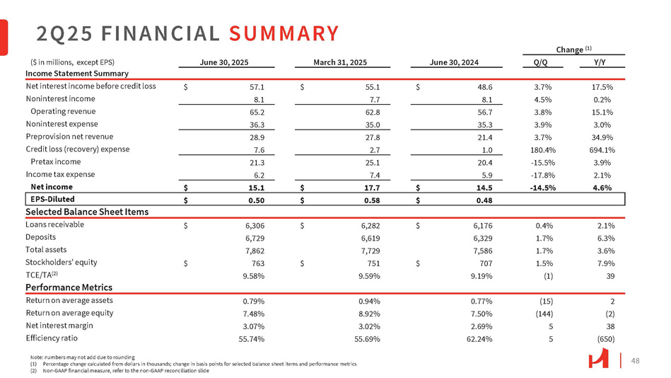 48 2 Q 25 FINANCIAL SUMMARY Note: numbers may not add due to rounding (1) Percentage change calculated from dollars in thousands; change in basis points for selected balance sheet items and performance metrics (2) Non - GAAP financial measure, refer to the non - GAAP reconciliation slide Change (1) Y/Y Q/Q June 30, 2024 March 31, 2025 June 30, 2025 ($ in millions, except EPS) Income Statement Summary 17.5% 3.7% 48.6 $ 55.1 $ 57.1 $ Net interest income before credit loss 0.2% 4.5% 8.1 7.7 8.1 Noninterest income 15.1% 3.8% 56.7 62.8 65.2 Operating revenue 3.0% 3.9% 35.3 35.0 36.3 Noninterest expense 34.9% 3.7% 21.4 27.8 28.9 Preprovision net revenue 694.1% 180.4% 1.0 2.7 7.6 Credit loss (recovery) expense 3.9% - 15.5% 20.4 25.1 21.3 Pretax income 2.1% - 17.8% 5.9 7.4 6.2 Income tax expense 4.6% - 14.5% 14.5 $ 17.7 $ 15.1 $ Net income 0.48 $ 0.58 $ 0.50 $ EPS - Diluted Selected Balance Sheet Items 2.1% 0.4% 6,176 $ 6,282 $ 6,306 $ Loans receivable 6.3% 1.7% 6,329 6,619 6,729 Deposits 3.6% 1.7% 7,586 7,729 7,862 Total assets 7.9% 1.5% 707 $ 751 $ 763 $ Stockholders’ equity 39 (1) 9.19% 9.59% 9.58% TCE/TA (2) Performance Metrics 2 (15) 0.77% 0.94% 0.79% Return on average assets (2) (144) 7.50% 8.92% 7.48% Return on average equity 38 5 2.69% 3.02% 3.07% Net interest margin (650) 5 62.24% 55.69% 55.74% Efficiency ratio
