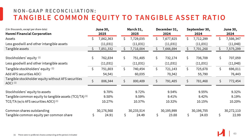 49 NON - G A A P R E C O N C I L I A T I O N : TANGIBLE COMMON EQUITY TO TANGIBLE ASSET RATIO (1) There were no preferred shares outstanding at the periods indicated June 30, September 30, December 31, March 31, June 30, ($ in thousands, except per share data) 2024 2024 2024 2025 2025 Hanmi Financial Corporation $ 7,586,347 $ 7,712,299 $ 7,677,925 $ 7,729,035 $ 7,862,363 Assets (11,048) (11,031) (11,031) (11,031) (11,031) Less goodwill and other intangible assets $ 7,575,299 $ 7,701,268 $ 7,666,894 $ 7,718,004 $ 7,851,332 Tangible assets $ 707,059 $ 736,709 $ 732,174 $ 751,485 $ 762,834 Stockholders' equity (1) (11,048) (11,031) (11,031) (11,031) (11,031) Less goodwill and other intangible assets $ 696,011 $ 725,678 $ 721,143 $ 740,454 $ 751,803 Tangible stockholders' equity (1) 76,443 55,790 70,342 60,035 54,541 Add AFS securities AOCI $ 772,454 $ 781,468 $ 791,485 $ 800,489 $ 806,344 Tangible stockholder equity without AFS securities AOCI (1) 9.32% 9.55% 9.54% 9.72% 9.70% Stockholders' equity to assets 9.19% 9.42% 9.41% 9.59% 9.58% Tangible common equity to tangible assets (TCE/TA) (1) 10.20% 10.15% 10.32% 10.37% 10.27% TCE/TA (w/o AFS securities AOCI) (1) 30,272,110 30,196,755 30,195,999 30,233,514 30,176,568 Common shares outstanding $ 22.99 $ 24.03 $ 23.88 $ 24.49 $ 24.91 Tangible common equity per common share