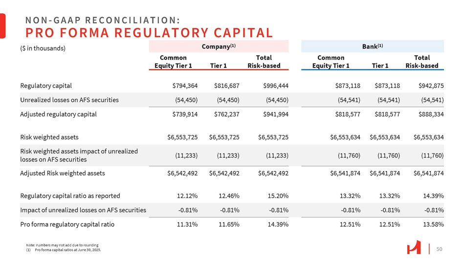 50 NON - G A A P R E C O N C I L I A T I O N : PRO FORMA REGULATORY CAPITAL Bank (1) Company (1) ($ in thousands) Total Risk - based Tier 1 Common Equity Tier 1 Total Risk - based Tier 1 Common Equity Tier 1 $942,875 $873,118 $873,118 $996,444 $816,687 $794,364 Regulatory capital (54,541) (54,541) (54,541) (54,450) (54,450) (54,450) Unrealized losses on AFS securities $888,334 $818,577 $818,577 $941,994 $762,237 $739,914 Adjusted regulatory capital $6,553,634 $6,553,634 $6,553,634 $6,553,725 $6,553,725 $6,553,725 Risk weighted assets (11,760) (11,760) (11,760) (11,233) (11,233) (11,233) Risk weighted assets impact of unrealized losses on AFS securities $6,541,874 $6,541,874 $6,541,874 $6,542,492 $6,542,492 $6,542,492 Adjusted Risk weighted assets 14.39% 13.32% 13.32% 15.20% 12.46% 12.12% Regulatory capital ratio as reported - 0.81% - 0.81% - 0.81% - 0.81% - 0.81% - 0.81% Impact of unrealized losses on AFS securities 13.58% 12.51% 12.51% 14.39% 11.65% 11.31% Pro forma regulatory capital ratio Note: numbers may not add due to rounding (1) Pro forma capital ratios at June 30, 2025.