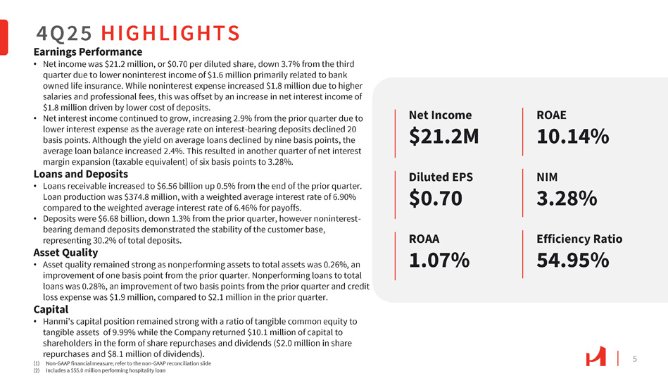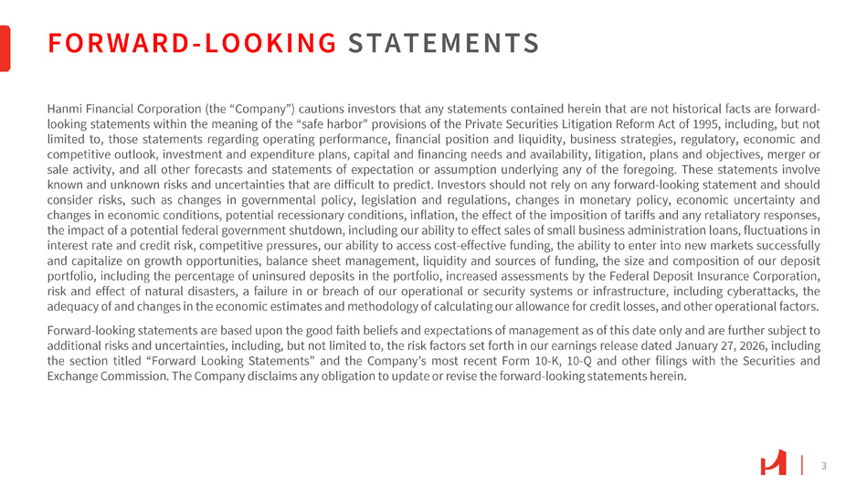 3 FORWARD - LOOKING STATEMENTS Hanmi Financial Corporation (the “Company”) cautions investors that any statements contained herein that are not historical facts are forward - looking statements within the meaning of the “safe harbor” provisions of the Private Securities Litigation Reform Act of 1995 , including, but not limited to, those statements regarding operating performance, financial position and liquidity, business strategies, regulatory, economic and competitive outlook, investment and expenditure plans, capital and financing needs and availability, litigation, plans and objectives, merger or sale activity, and all other forecasts and statements of expectation or assumption underlying any of the foregoing . These statements involve known and unknown risks and uncertainties that are difficult to predict . Investors should not rely on any forward - looking statement and should consider risks, such as changes in governmental policy, legislation and regulations, changes in monetary policy, economic uncertainty and changes in economic conditions, potential recessionary conditions, inflation, the effect of the imposition of tariffs and any retaliatory responses, the impact of a potential federal government shutdown, including our ability to effect sales of small business administration loans, fluctuations in interest rate and credit risk, competitive pressures, our ability to access cost - effective funding, the ability to enter into new markets successfully and capitalize on growth opportunities, balance sheet management, liquidity and sources of funding, the size and composition of our deposit portfolio, including the percentage of uninsured deposits in the portfolio, increased assessments by the Federal Deposit Insurance Corporation, risk and effect of natural disasters, a failure in or breach of our operational or security systems or infrastructure, including cyberattacks, the adequacy of and changes in the economic estimates and methodology of calculating our allowance for credit losses, and other operational factors . Forward - looking statements are based upon the good faith beliefs and expectations of management as of this date only and are further subject to additional risks and uncertainties, including, but not limited to, the risk factors set forth in our earnings release dated January 27 , 2026 , including the section titled “Forward Looking Statements” and the Company’s most recent Form 10 - K, 10 - Q and other filings with the Securities and Exchange Commission . The Company disclaims any obligation to update or revise the forward - looking statements herein .