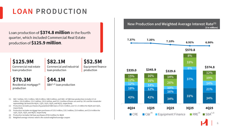 5 Net Income $21.2M Diluted EPS $0.70 ROAA 1.07% ROAE 10.14% NIM 3.28% Efficiency Ratio 54.95% Earnings Performance • Net income was $21.2 million, or $0.70 per diluted share, down 3.7% from the third quarter due to lower noninterest income of $1.6 million primarily related to bank owned life insurance. While noninterest expense increased $1.8 million due to higher salaries and professional fees, this was offset by an increase in net interest income of $1.8 million driven by lower cost of deposits. • Net interest income continued to grow, increasing 2.9% from the prior quarter due to lower interest expense as the average rate on interest - bearing deposits declined 20 basis points. Although the yield on average loans declined by nine basis points, the average loan balance increased 2.4%. This resulted in another quarter of net interest margin expansion (taxable equivalent) of six basis points to 3.28%. Loans and Deposits • Loans receivable increased to $6.56 billion up 0.5% from the end of the prior quarter. Loan production was $374.8 million, with a weighted average interest rate of 6.90% compared to the weighted average interest rate of 6.46% for payoffs. • Deposits were $6.68 billion, down 1.3% from the prior quarter, however noninterest - bearing demand deposits demonstrated the stability of the customer base, representing 30.2% of total deposits. Asset Quality • Asset quality remained strong as nonperforming assets to total assets was 0.26%, an improvement of one basis point from the prior quarter. Nonperforming loans to total loans was 0.28%, an improvement of two basis points from the prior quarter and credit loss expense was $1.9 million, compared to $2.1 million in the prior quarter. Capital • Hanmi's capital position remained strong with a ratio of tangible common equity to tangible assets of 9.99% while the Company returned $10.1 million of capital to shareholders in the form of share repurchases and dividends ($2.0 million in share repurchases and $8.1 million of dividends). (1) Non - GAAP financial measure; refer to the non - GAAP reconciliation slide (2) Includes a $55.0 million performing hospitality loan 4Q25 HIGHLIGHTS