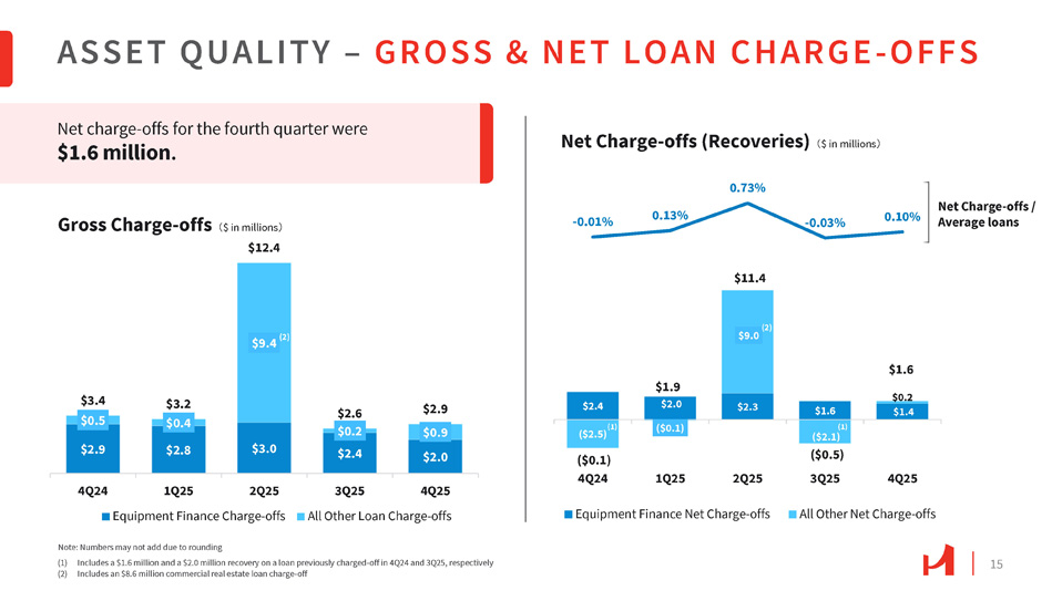 14 Nonperforming assets were $20.1 million at the end of the fourth quarter, down from $21.4 million at the end of the third quarter. $14.3 $35.6 $26.0 $19.4 $18.1 $0.1 $0.1 $2.0 $2.0 $14.4 $35.7 $26.0 $21.4 $20.1 0.19% 0.46% 0.33% 0.27% 0.26% 4Q25 3Q25 OREO ASSET QUALITY – NONPERFORMING ASSETS & NONACCRUAL LOANS (1) Nonperforming assets exclude repossessed personal property of $0.6 million, $0.7 million, $0.6 million, $0.4 million, and $0.6 million for 4Q24, 1Q25, 2Q25, 3Q25, and 4Q25, respectively (2) Specific allowance for credit losses for 4Q24, 1Q25, 2Q25, 3Q25, and 4Q25 was $6.2 million, $11.8 million, $4.1 million, $4.4 million, and $3.4 million, respectively (3) RRE includes consumer loans (4) Represents a $10.2 million CRE loan at 4Q25 4Q24 1Q25 2Q25 Nonperforming loans Note: Numbers may not add due to rounding $8.8 $8.2 $7.0 $4.5 $2.8 $4.0 $4.0 $1.7 $0.3 $6.8 $20.0 $11.0 $10.6 $35.5 (2) $19.4 2Q25 4Q25 4Q24 1Q25 Equipment Finance All other CRE and C&I < $3M $14.3 (2) $3.6 $1.9 3Q25 RRE (3) $18.1 (2) All other CRE and C&I >= $3M (2) $26.0 (2) $10.2 (4) $1.7 $1.1 $5.1 Nonperforming Assets (1) 㸦 $ in millions 㸧 Nonaccrual Loans 㸦 $ in millions 㸧 Nonperforming assets / Total assets