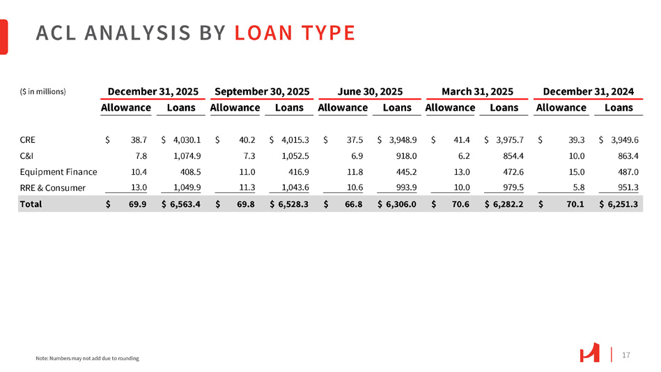 16 $70.1 $70.6 $66.8 $69.8 $69.9 1.06% 1.07% 1.07% Allowance for Credit Losses 㸦 $ in millions 㸧 1.12% 1.12% 4Q24 1Q25 2Q25 Allowance for credit losses 3Q25 4Q25 ACL to Loans $0.9 $2.7 Credit Loss Expense 㸦 $ in millions 㸧 $7.6 $2.1 $1.9 4Q24 1Q25 2Q25 Credit loss expense 3Q25 4Q25 Allowance for credit losses was $69.9 million at December 31, 2025, or 1.07% to total loans, compared with $69.8 million , or 1.07% of total loans, at the end of the prior quarter. ACL TREND